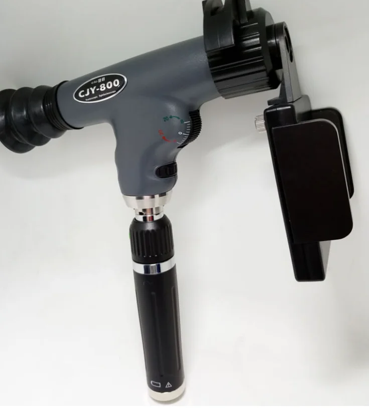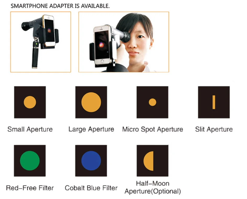 1. Rapid capture of fundus images on your cellphone. 2. Get eyeground documentation in an easy and low-cost way. 3. Send images to your peers across the continum of care instantly. 4. Easy carry to capture images at any clinical circumstance and work efficiently.Make patient education easier. 5. 5X larger view of the fundus vs. standard ophthalmoscopes in an undilated eye. 6. Aperturesand Filters:Small Aperture, Large Aperture,Micro Spot Aperture, Slit Aperture, Red-Free Filter, Cobalt Blue Filter, Half-MoonAperture(Optional). 7. Looking at the pupil through an add-on corneal viewing lens, the practitioner can detect lensopacities easily. In the same way, vitreous opacities could be detected by asking the patient look up and down,to the right and to the left. Because the eye changes position or returns to the primary position,all vitreous opacities could be seen moving across the pupil area.