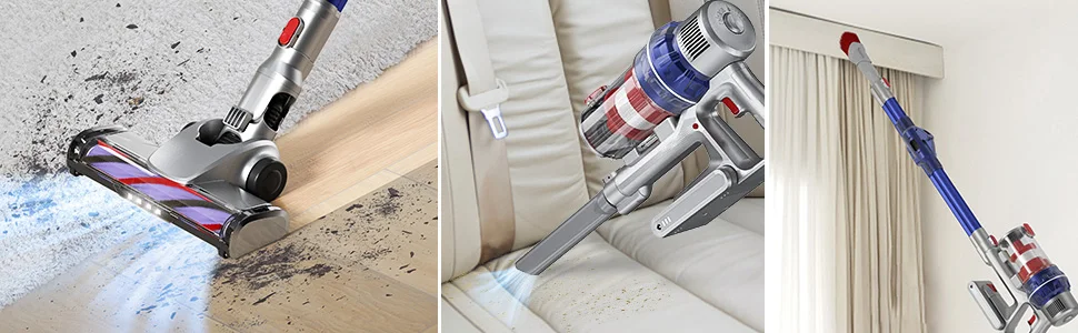 The electric multi-functional floor brush head with unique design is suitable for all types of floors and can effectively improve the dust collection effect. The LED light illuminates every dark corner and helps detect dust.