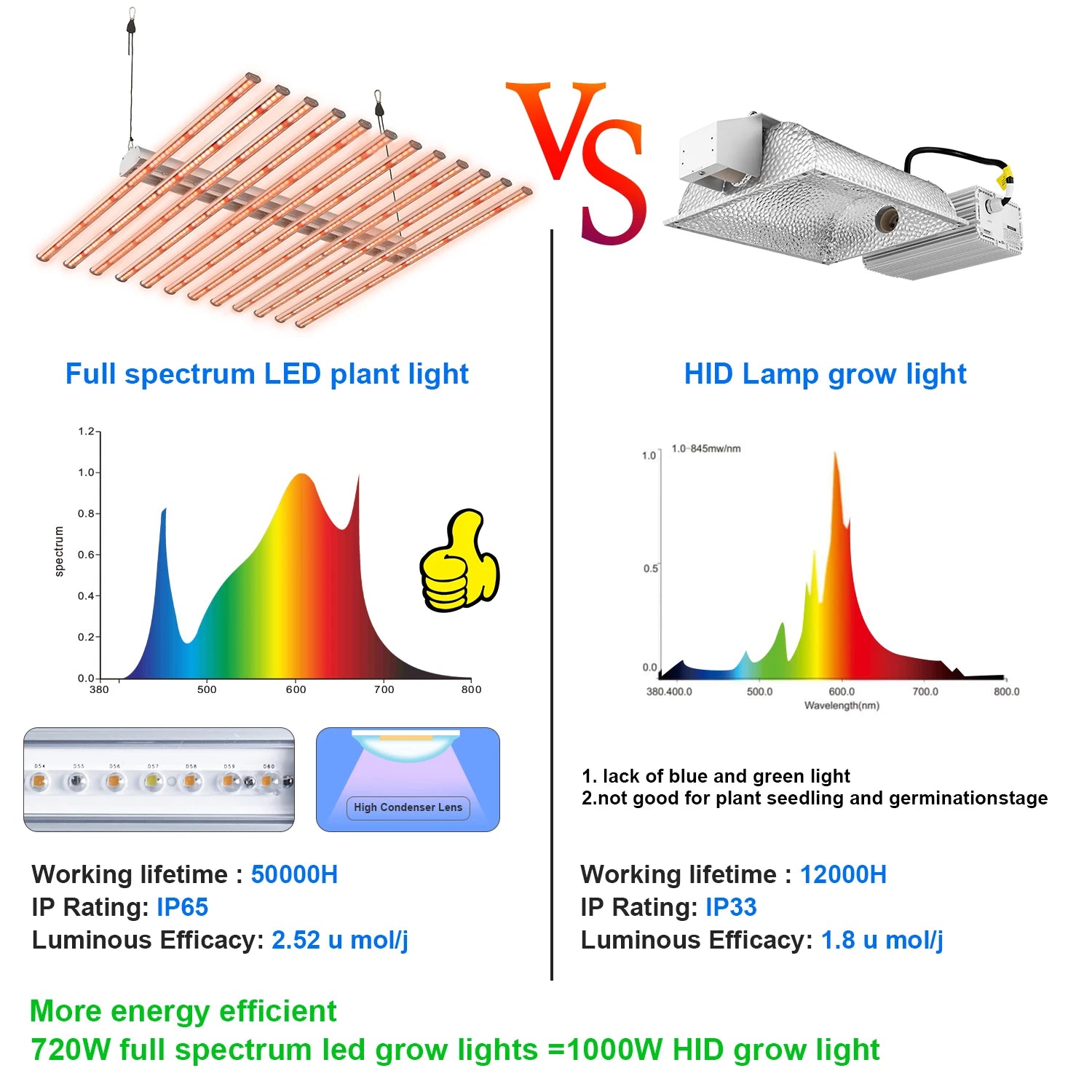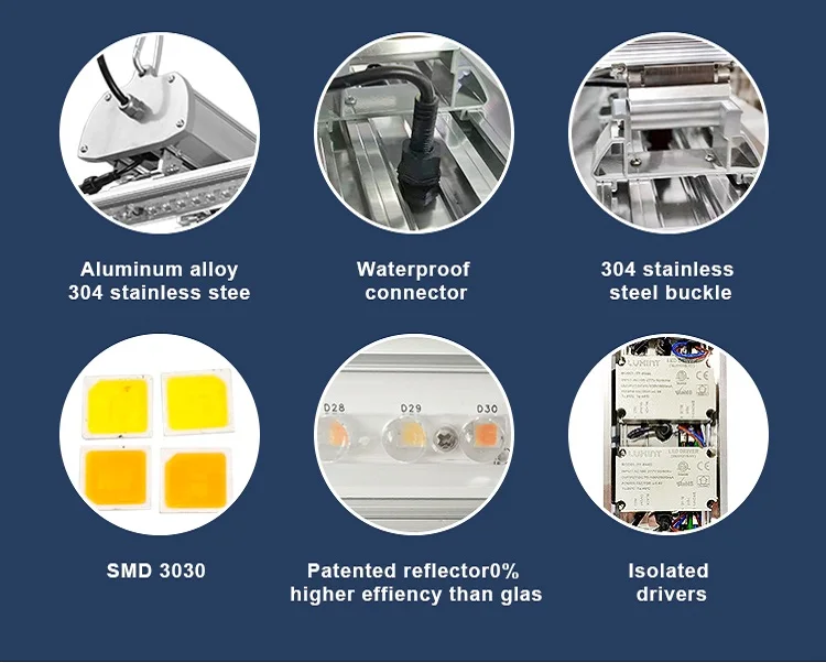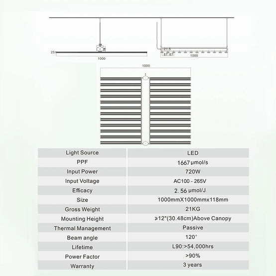 Full spectrum led grow lights For Indoor Plants, Vegetables & Flowers Performs extremely well in cloning, vegetative and flowering cycle Replaces 1000w HID lamp. High quality smd 3030 led chips Use for all stages of plant growth Full spectrum 380-780nm Advanced LED Drivers for Higher Performance Eliminates A/C in most grow spaces due to very low heat output Without Fan, the use-life longer. Environmentally friendly (No Mercury) Five foot Power Cord in 110v US with 220v and International Plugs Available Maximum 120° adjustable for each bar.