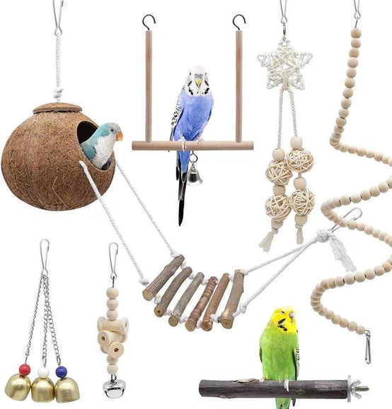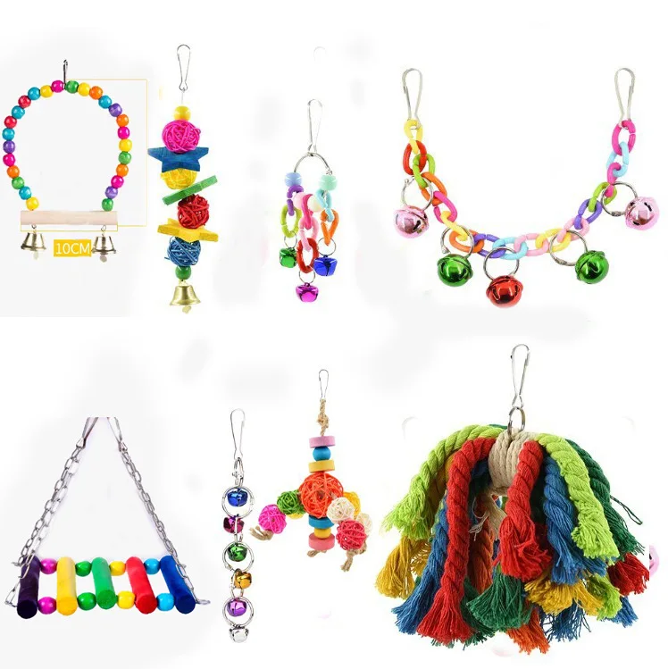 Manufactory 8PCS Parrot Swing Chewing Toys- Natural Wood Hanging Bell Bird Cage Parrot Bird Toys For Cages