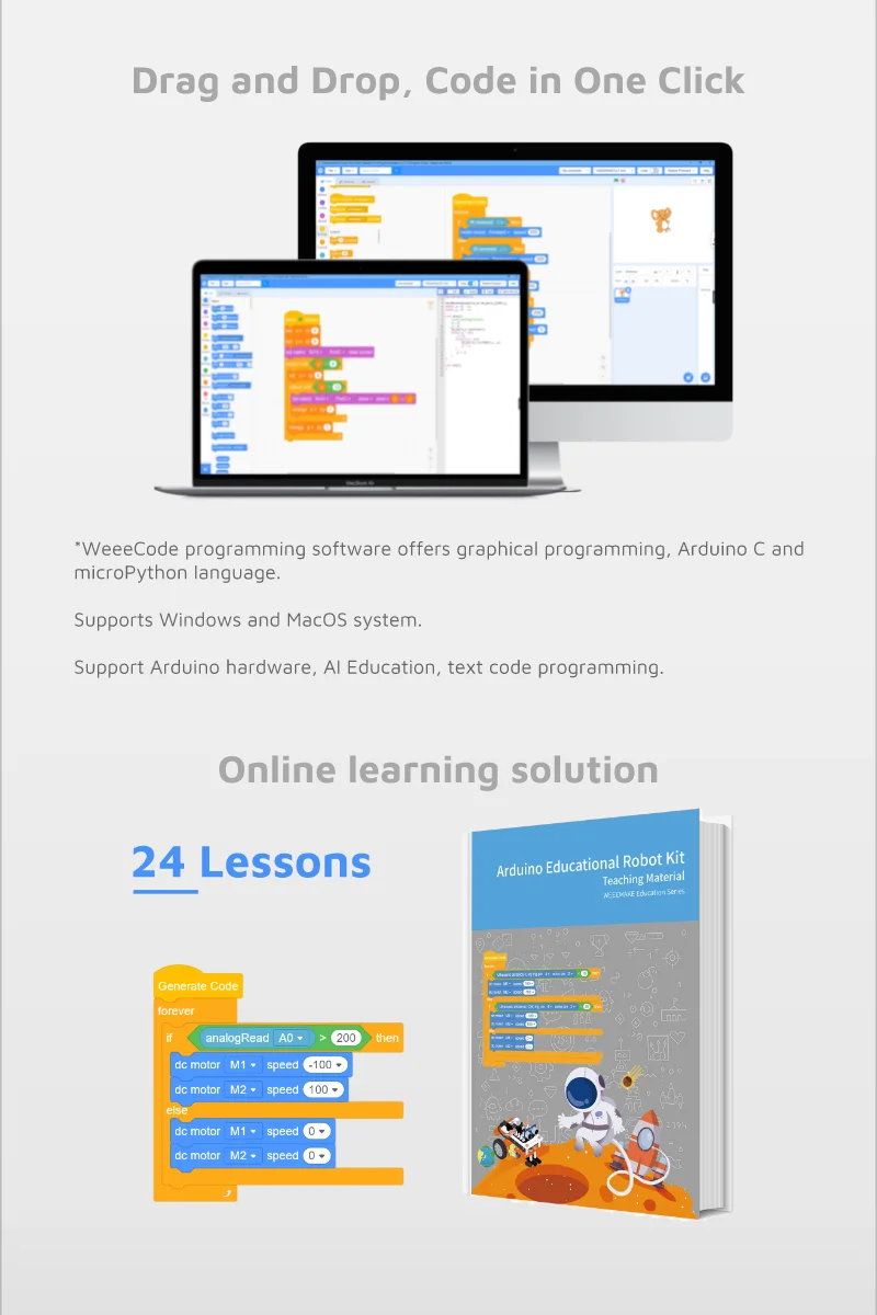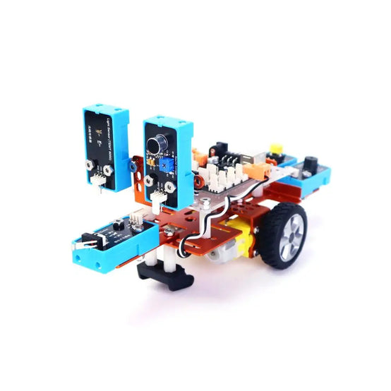 It is an inclusive DIY programming educational robot set based on the Arduino open source platform. Equipped with up to 12+ electronic modules, the structure is made of anodized aluminum alloy, which is environmentally friendly and durable; the electronic module uses RJ11 crystal heads, which can be easily connected and greatly reduce the use threshold.