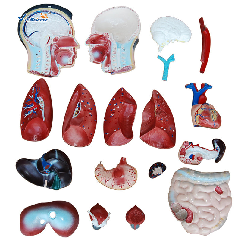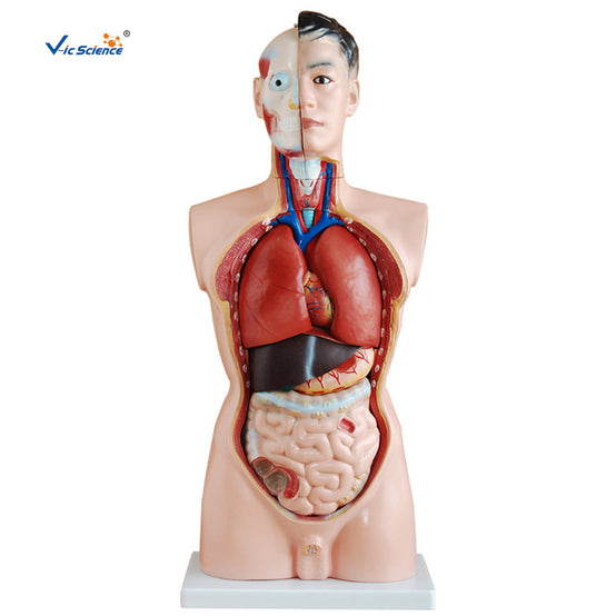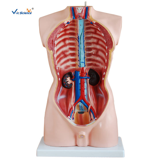 This is a full-size male torso. Hand painted and meticulously assembled to simulate human anatomy. Dissects into 19 parts: torso, head (2 parts), brain, lung (4 parts), heart, trachea, esophagus and descending aorta, diaphragm, stomach, duodenum with pancreas and spleen, intestines, kidney, liver and bladder (2 parts). Mounted on plastic base.