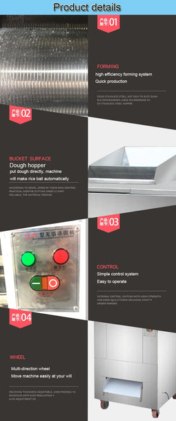 This rice ball making machine is invented according to customer demand research and development of products. For hanging furnace baked cake, tapioca pearl, taro ball, hanging furnace baked cake, steamed stuffed bun, dumplings, bread, moon cake and other dough products,This machine is suitable for wheat steamed bread powder with water, additives and dough shaping, dough through extrusion, transmission, shear, round national law processing balls. This machine can help you do the diameter of 6-40mm, 5-300g range of any choice of two specifications factory.