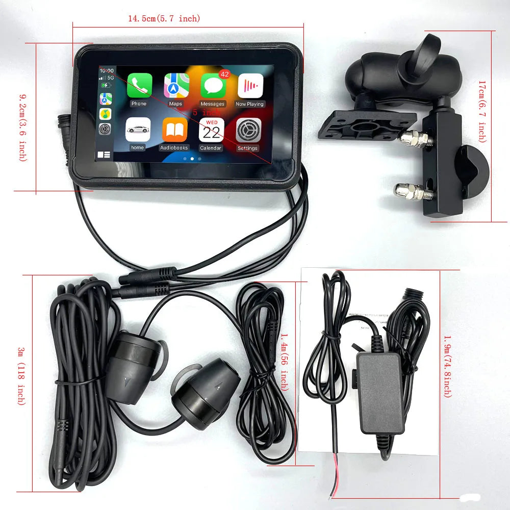 1.【Motorcycle Touchscreen Unit with Wireless Apple CarPlay & Wireless Android Auto】 CarPlay & Android Auto is a smarter, safer way to use your phone in your motorcycle. CarPlay & Android Auto takes the things you want to do with your phone while motorcycle Riding and puts them right on this smart touch screen, you can gps navigation, make calls, enjoy your favorite music etc. With Siri Voice Control/Google_Assistant, control with a word or a touch, super convenient. 2.【Easy Installation, Fit for All Motorcycle】 This portable carplay screen comes with bracket kits and tools, you can mount it on the motorcycle handle (the wiring is simple, ACC +12V and Ground), the mount guards against drops and vibration. 3.【Waterproof & Anti-Theft Design】 The motorcycle GPS has has rugged, ipx7 waterproof design and thief-proof detachable capacitive touchscreen remain under your control. 4.【Portable CarPlay with Built-in Dual Bluetooth 】 Pair your phone to the carplay touch screen via Bt, pair the unit to your Bt helmet/earphone, then you can adjust the volume/switch songs and make hands-free calls by your helmet or earphone,so easy. 5.【HD Touch Screen】5-inch screen with 800x480 HD IPS screen, enjoy the features such as carplay/android auto gps navigation, play music and more!