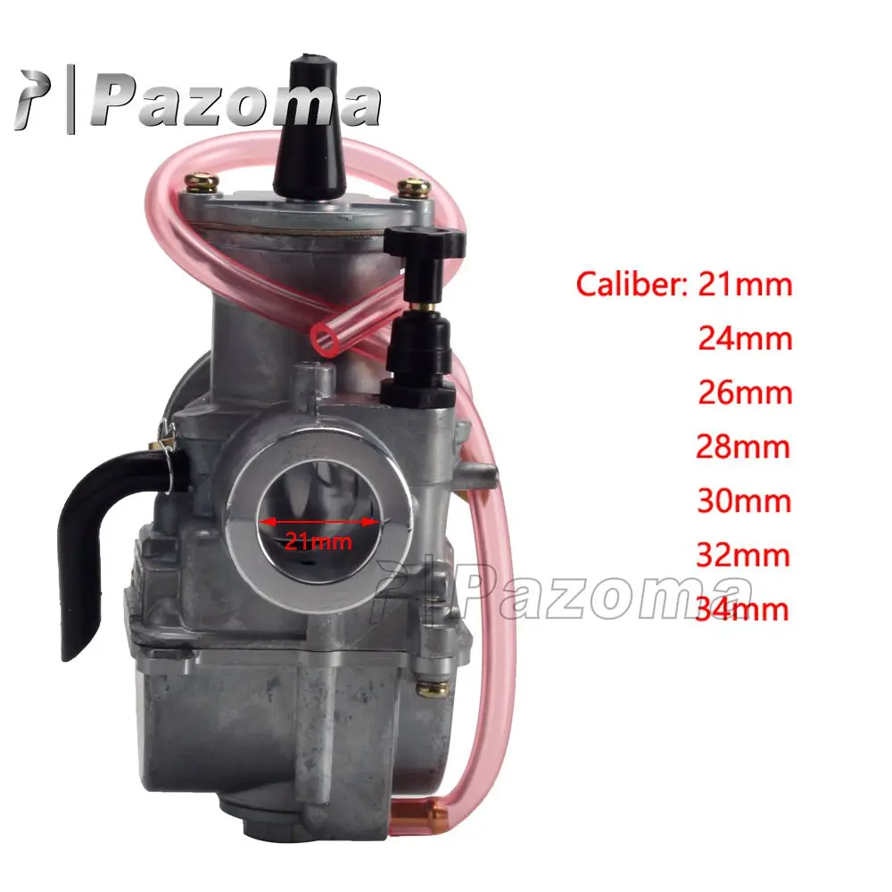For 21 mm: 50cc to 100cc engine For 24 mm: 90cc to 125cc engine For 26 mm: 90cc to 125cc engine For 28 mm: 125cc to 150cc engine For 30 mm: 150cc to 250cc engine For 32 mm: 250cc to 300cc engine For 34 mm: 250cc to 350cc engine