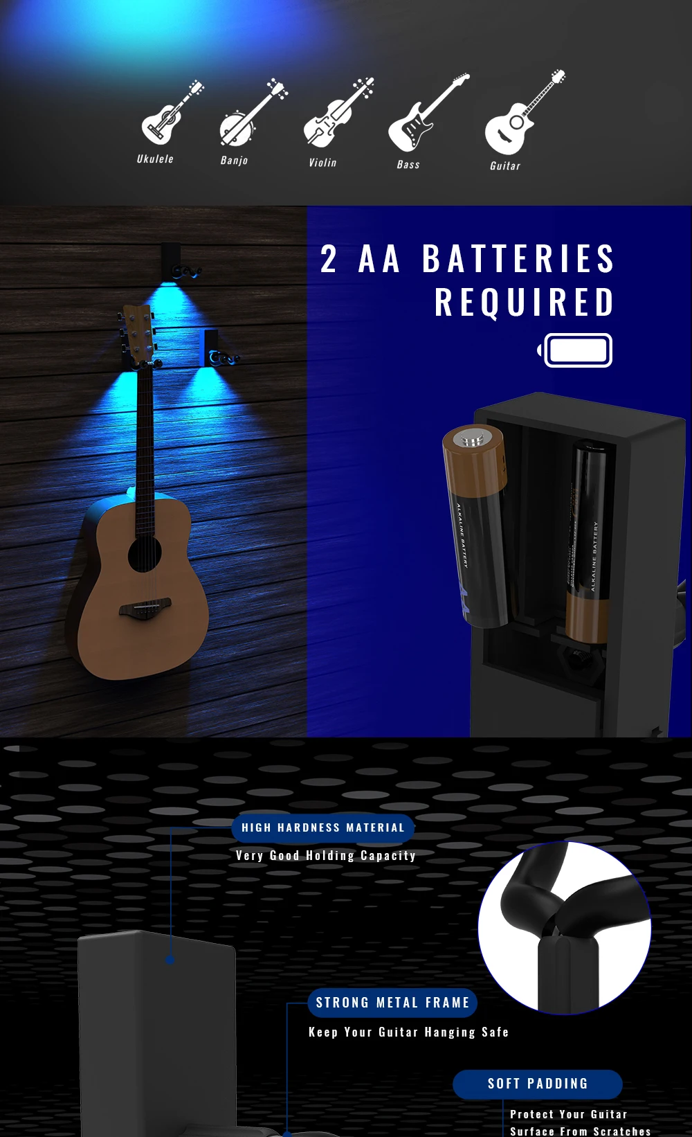 It will work as a guitar wall mount, a ukulele wall mount bracket, a bass guitar wall mount hanger bracket, a violin wall hanger,or any of them as a light up display for your musical instrument.