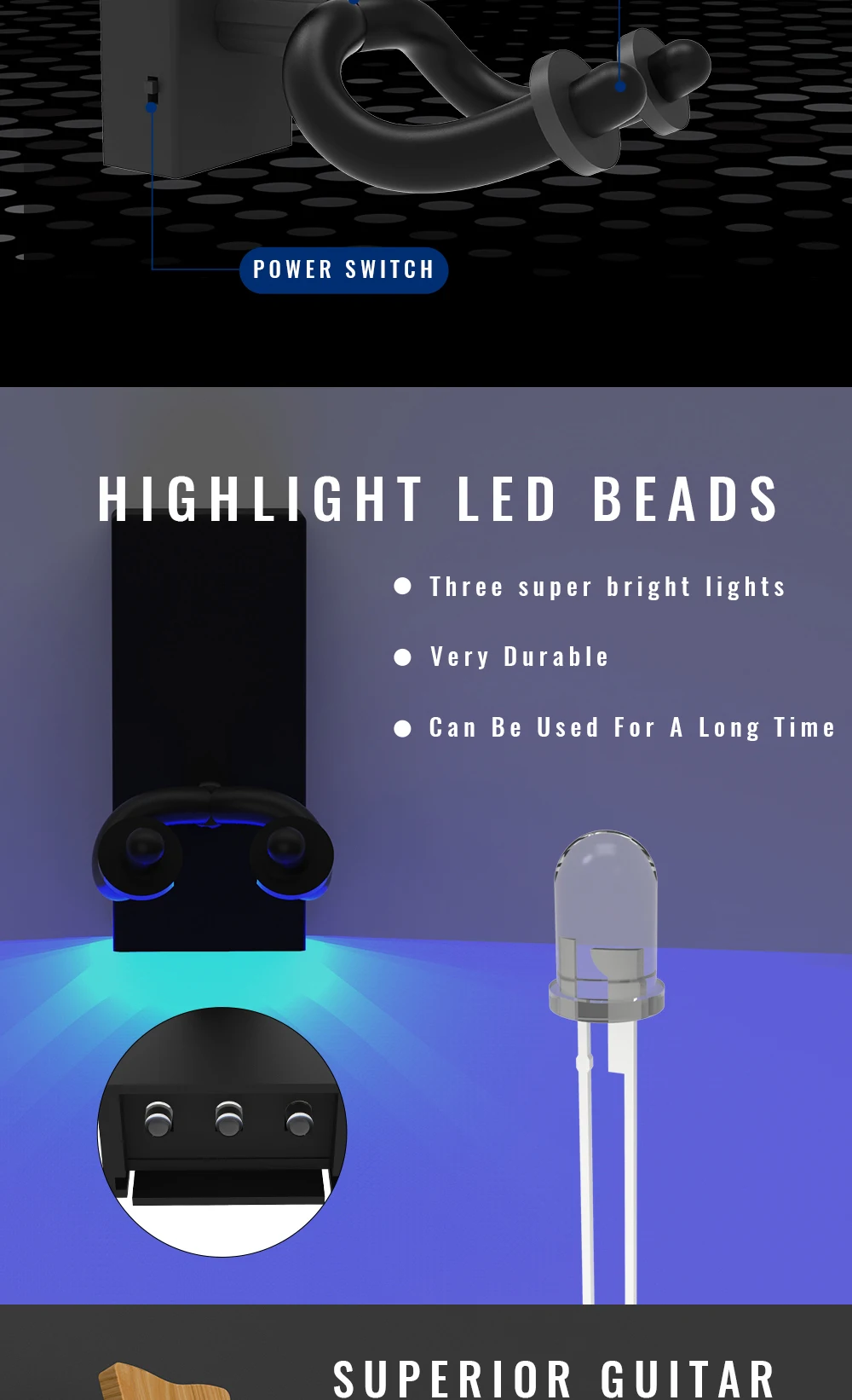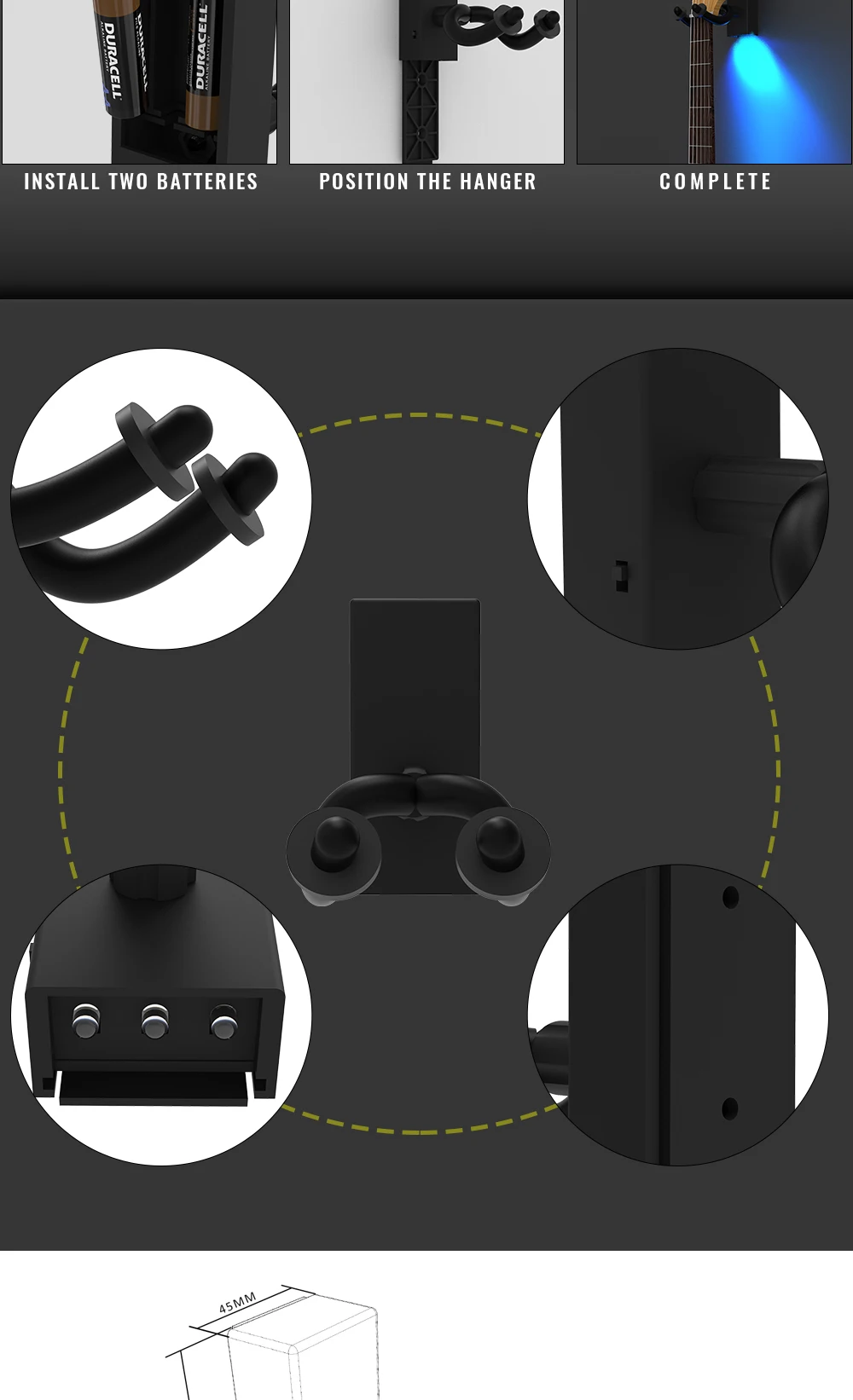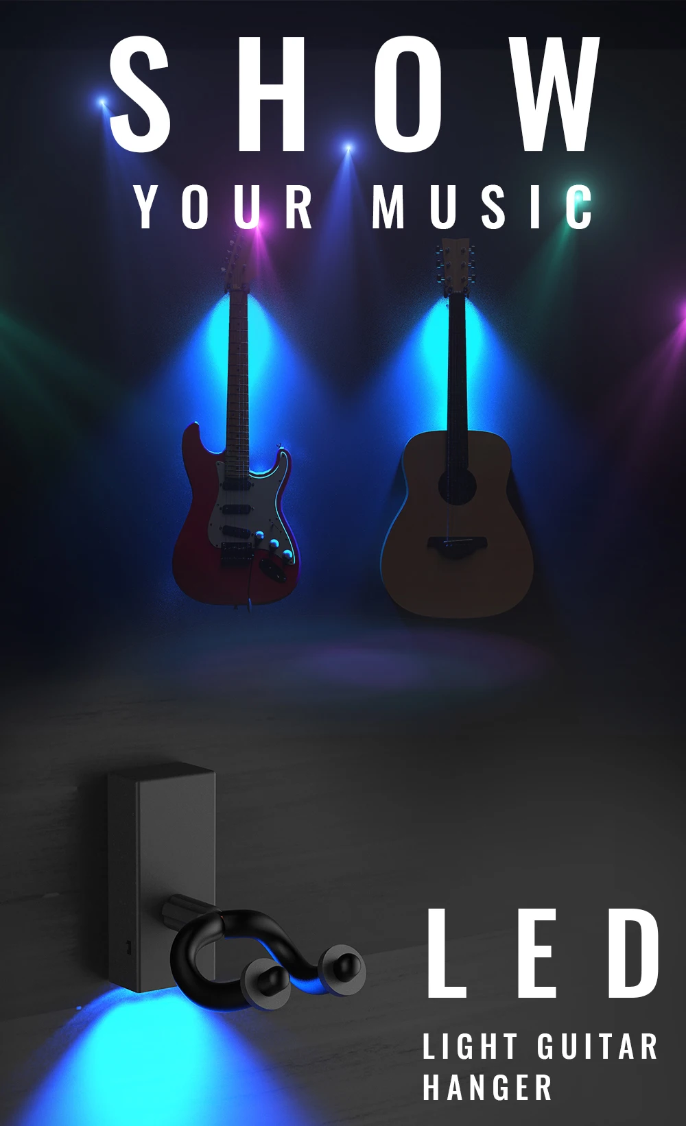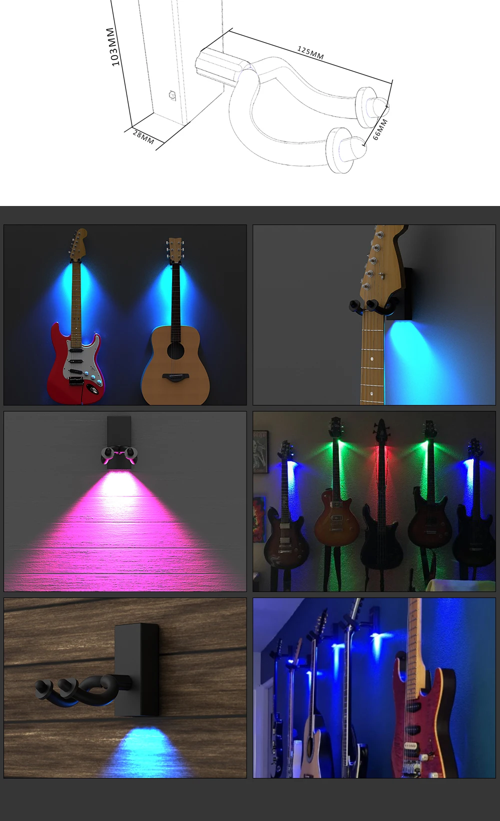 This LED guitar wall mount hanger / holder is just desgined by NAOMI Company with strong steel hanger cover by soft rubber.