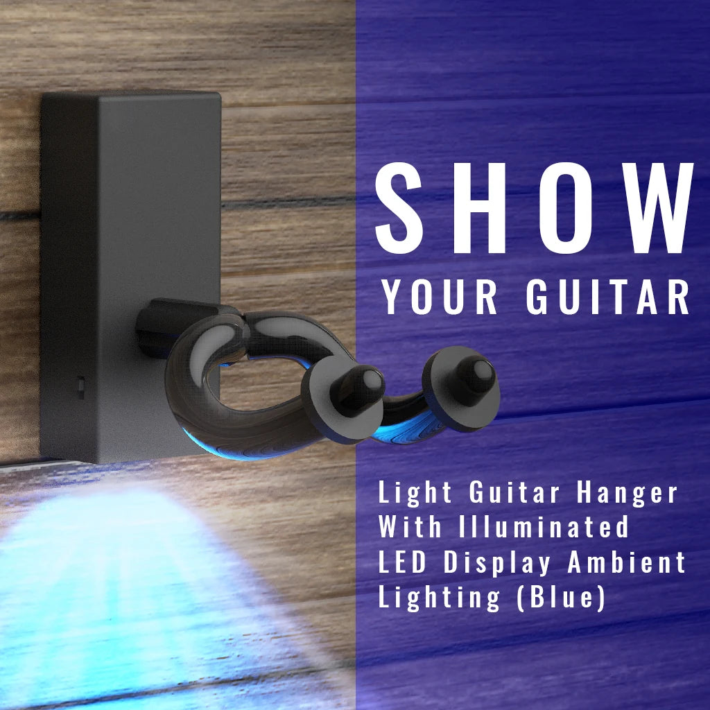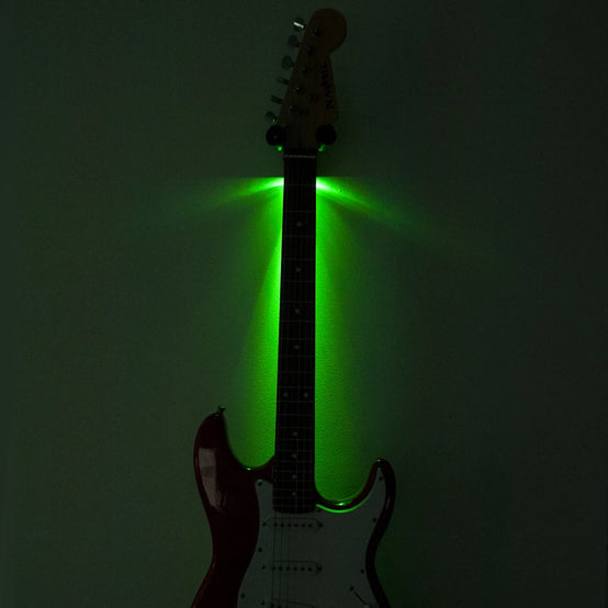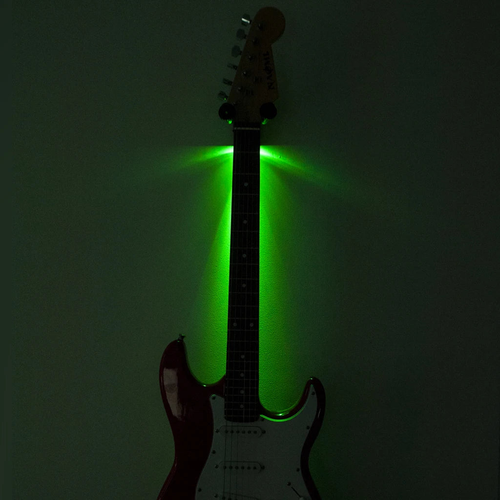 Just slide your guitar onto the wall mount bracket hanger and flip the switch to turn on the LEDs in your guitar wall hanger and it lights up your guitar with incredible light.