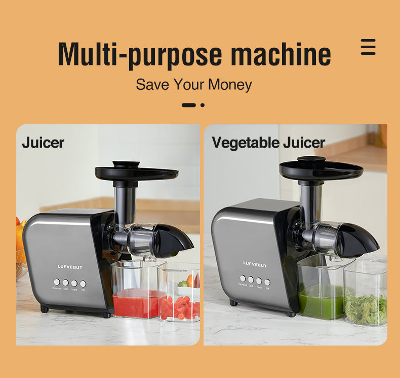 - Multifunctional Masticating Juicer: Designed with 2-speed control, this juicer meet the needs for juicing different fruits&veggies. You can run “SOFT” mode for squeezing vegetables and fruits like celery, cucumber, kiwi, lemon, watermelon, pineapple, tomato, orange and grape, etc. Or choose “HARD” mode for apple, pear, carrot, kale, spinach, wheat grass, beets, watercress, fennel, ginger, broccoli, etc. Operating voltage:110-240V.