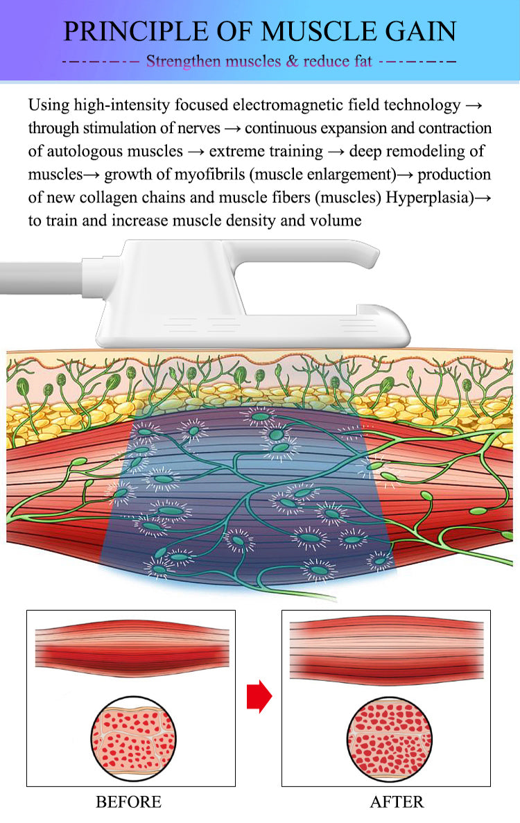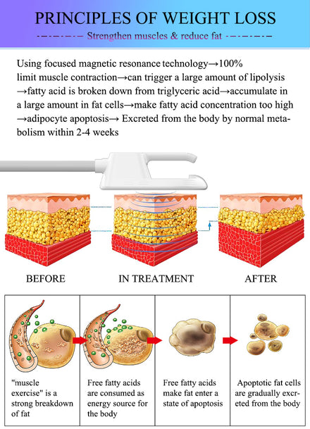 Using focused magnetic resonance technology→100%limit muscle contraction→can trigger a large amount of lipolysis →fatty acid is broken down from triglyceric acid→accumulate in a large amount in fat cells→make fatty acid concentration too high →adipocyte apoptosis→ Excreted from the body by normal metabolism within 2-4 weeks
