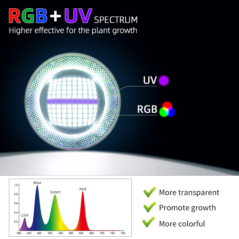The new technology of RGB-UV light chips make the color contrast distinct and to achieve the double effect of ornamental cultivation.