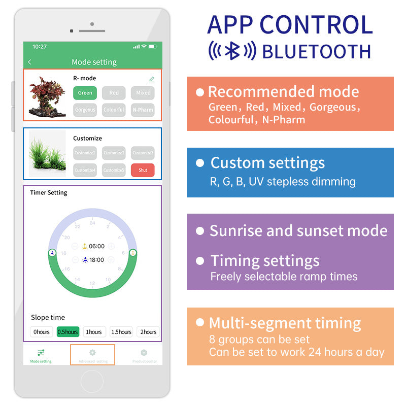 *APP Bluetooth control, there are 6 recommendation modes, 5 customized modes, Stepless dimming and sunrise sunset mode, suitable for planting various fish and aquatic plant planting.