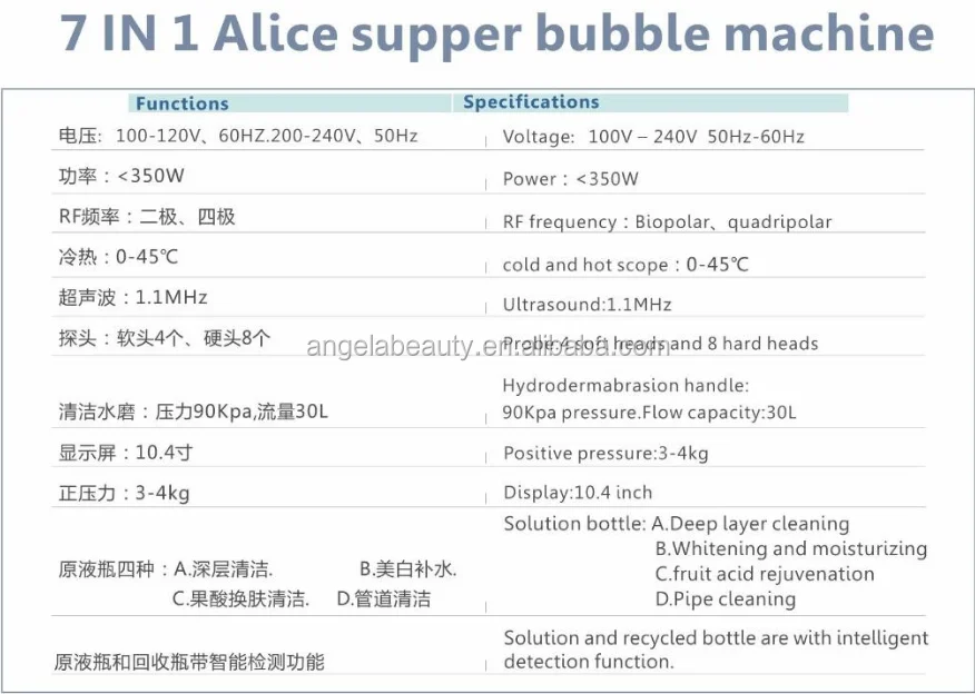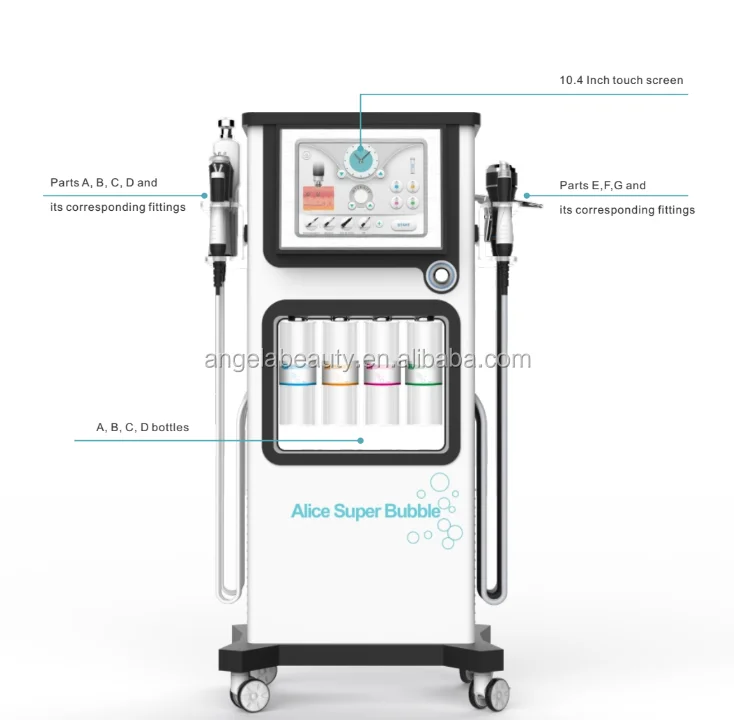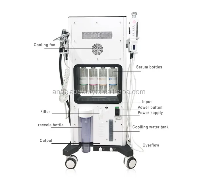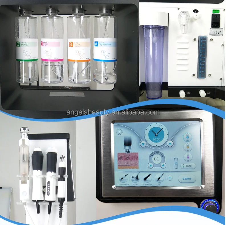 There are 4 bottle of solutions in this machine, A is the medical deep cleaning liquid,B is the medical oxygen liquid water,C is the pure fruit peptide liquid water,D is the pipeline cleaning disinfectant water.When operating the diamond dermabrasion handle, you can choose A,B and D bottle, A is for cleaning the black head and horny, B is for moisturizing and skin whitening. D bottle is for the pipe cleaning.When using the Calcium Carbonate Reguvenation vibration handle, you can use bottle C ,it has good effect on deep cleaning of black head and thick horny.