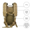 The front, sides and bottom feature modular (MOLLE) loops for attaching extra pouches or hanging gear. The back of the main compartment includes a zippered pouch designed to hold a hydration pouch, with ports on the top to access the drinking tube. Modular (MOLLE) loops throughout to attach external pouches or hang additional gear Four main exterior compartments, plus one rear velcro compartment. Measures 13″(L) x 9″(W) x 18″(H)
