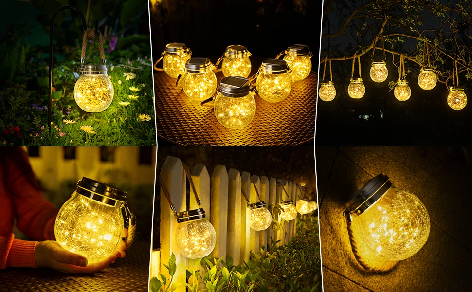 【Unique Design Solar Powered Lantern Light】 Cracked glass jar design create special light effect, sturdy stainless steel cap with solar panel, classic retro linen lanyard and 30 led copper wire string lights inside the glass jar, all of these will provide your a soft, romantic and fantasy mood. 【Auto ON/OFF】Solar energy supply, no extra utility electric cost, and no need to replace the battery. Built -in light sensor controls the solar lantern light charging at daytime and auto ON at dark. Just hang the solar light outdoor direct under the sunlight at daytime for 6-8 hours and it will light up for 8-12 hours at night. 【Waterproof IP65 & All Weather Available】The solar hanging lantern light can withstand all kind of weather(IP65), including heavy rain and snow, perfect for indoor and outdoor decorations. Hanging the solar light on trees, or put them in your garden, best decorative outdoor solar lights for patio, garden, yard, holiday party. 【Easy to Use and Operation】Just turn on the switch button on the back of the cap and the glass jar light will work automatically. Solar panel should be full charged when first use, please hang the solar lantern under direct sunlight for 6-8 hours. Then you can enjoy the light from the glass jar like little star or firefly at night, which makes your garden or tree beautiful and fantasy! 【Widely Application】You can place this solar lantern light on plants on balcony or on the pathway, ideal outdoor decorative solar lights for your home, yard, garden, holiday. Add warm and romantic atmosphere for your place. This solar jar lantern light will also be a surprise to your friends or families when it’s a gift.