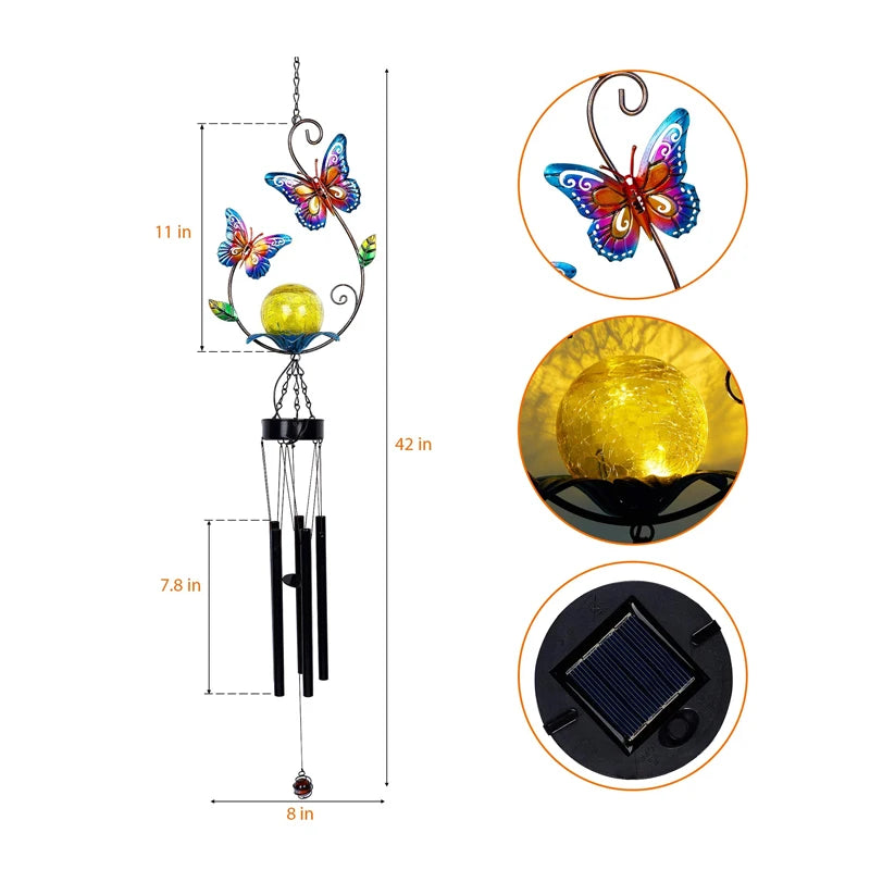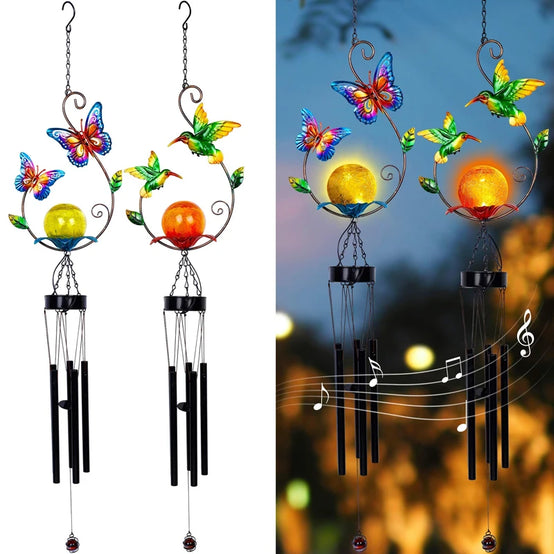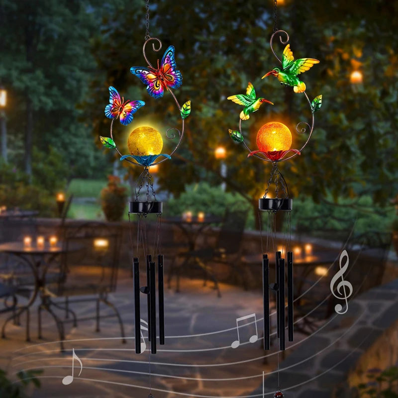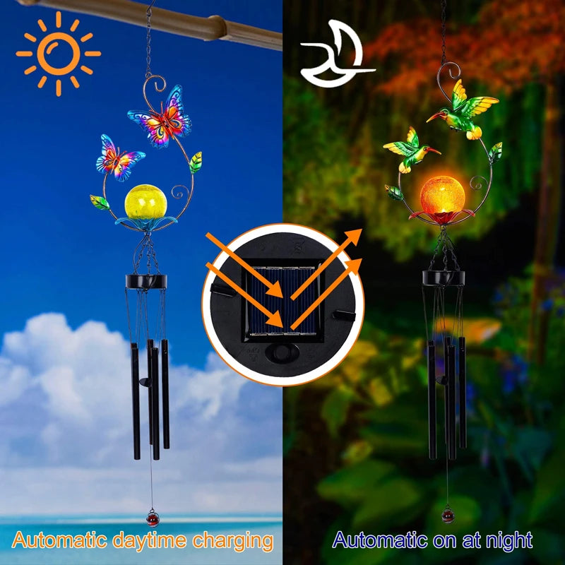 Outdoor Indoor Metal Led Solar Power Hummingbird Wind Chime Butterfly Solar Garden Wind Chime Crystal Ball Light For Decoration