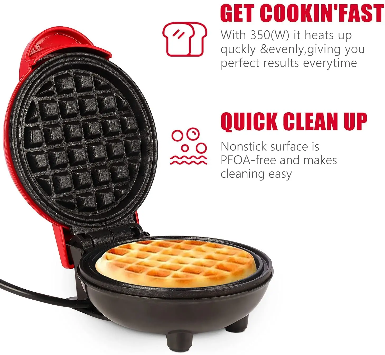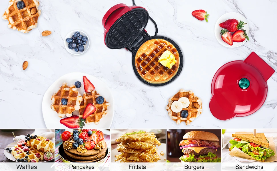 * EASE OF USE – Plug in, wait for ready indicator light, grease cooking plates, pour batter, close lid, wait 3 minutes and waffles are ready! Includes 9 delicious recipes!