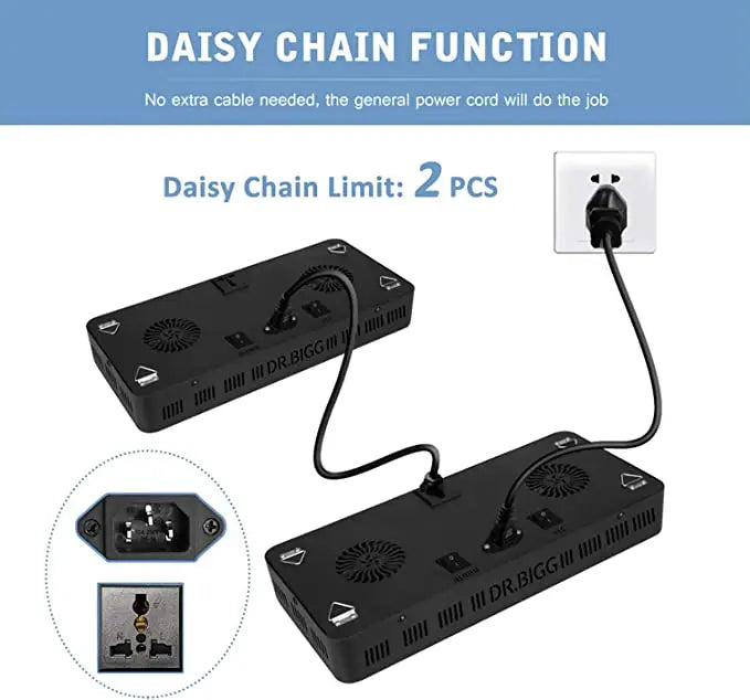 2.The included power cable comes with double functions which can be used to plug into a standard power outlet also into the Daisy Chain outlet of another grow light.