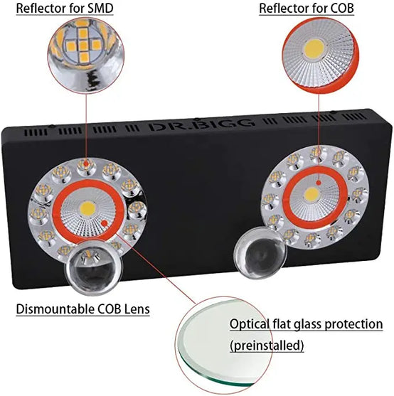 Uses the flat lens for germination, seedling, clone all vegetative stages and the 90 degrees COB optic lens for adult plants and flowering/fruiting