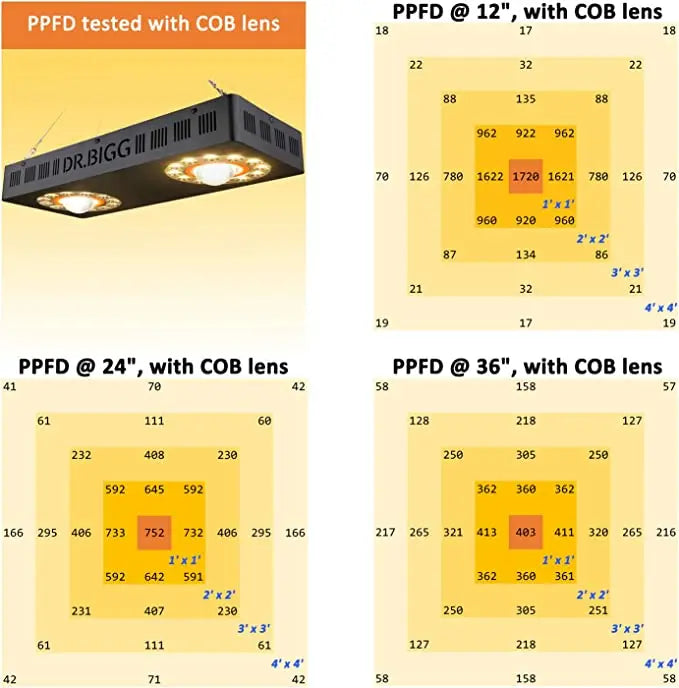 2.LIGHTING INTENSITY ADJUSTABLE: Preassembled flat lens for Vegetative Stages including Seedling, Clone, Microgreens, etc.Replace the flat lens with 90 degrees Optic Lens for Bloom/Fruiting Stages. With the COB lenses, the PAR (PPFD) can be increased up to 50% compared to the COB without lenses.