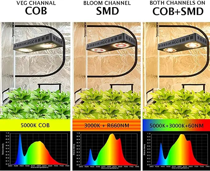 1. VEG & BLOOM TWO CHANNELS: CREE COB 5000K Cold White light for Veg Breeding, Seedling, Microgreen and Vegetative, Samsung LM301B 3000K Warm White and 660nm Red light for Flowering and Fruiting..