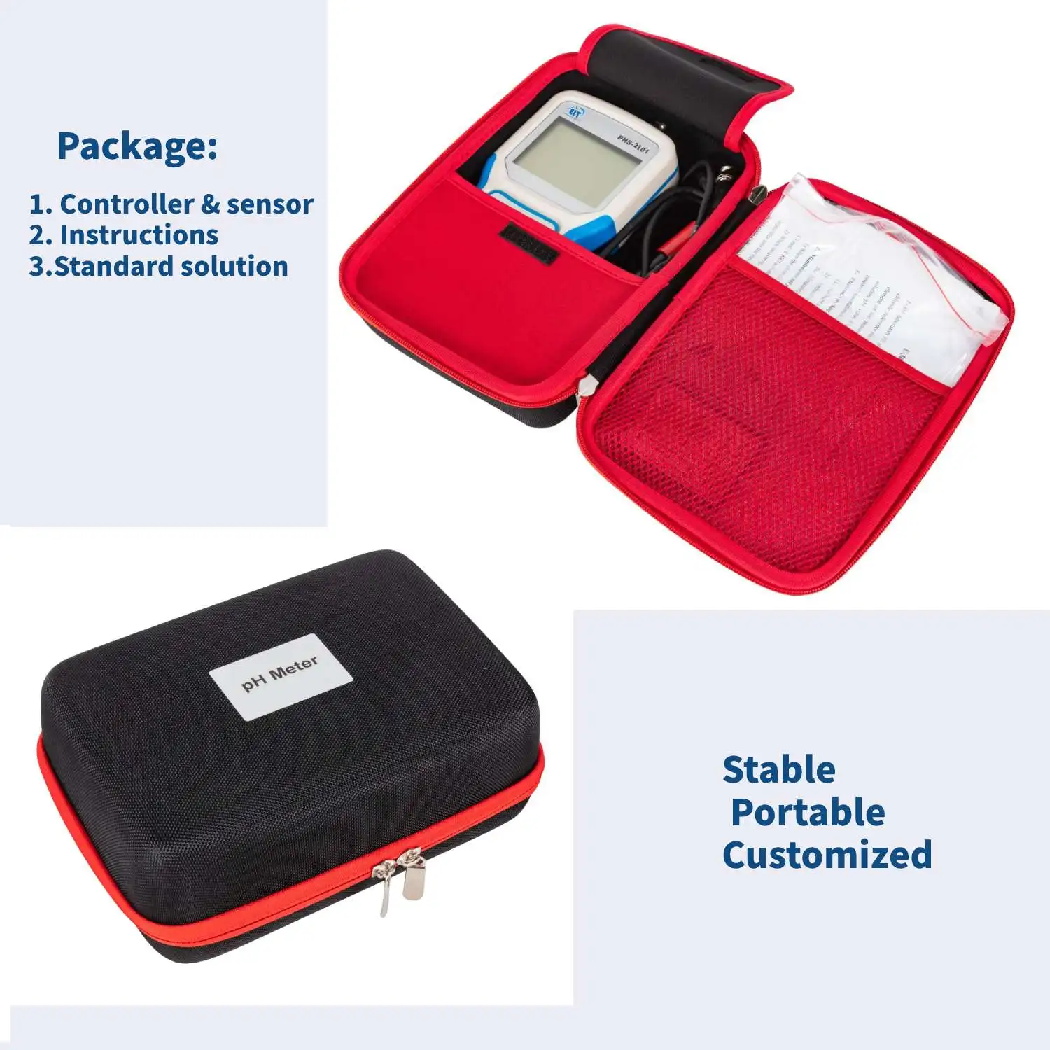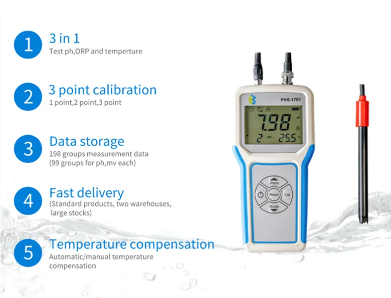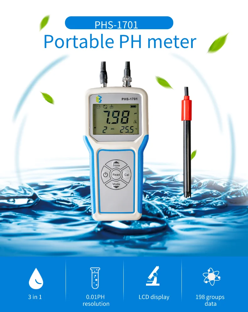 PHS-1701 portable pH meter is a digital display PH meter, with LCD digital display, which can display PH and temperature values simultaneously. The instrument applies to the labs in junior college institutions, research institutes, environmental monitoring,industrial and mining enterprises and other departments or field sampling to determine the aqueous solutions’ PH values and potential (mV) values. Equipped with ORP electrode, it can measure the solution’s ORP (oxidation-reduction potential) value;equipped with the ion specific electrode, it can measure the electrode potential value of the electrode.