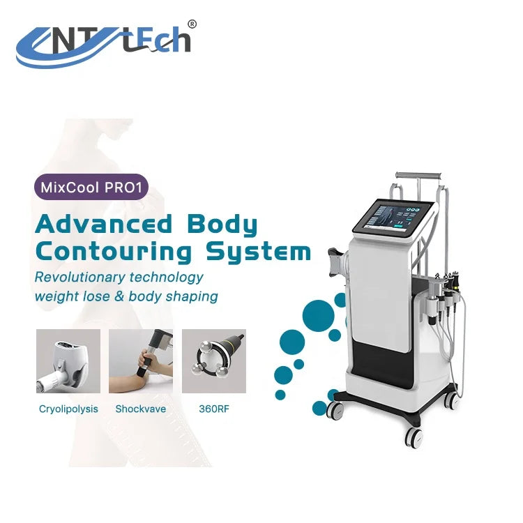 1. Cryo (freezing slimming): Powered by Cryo technology, MixCool PRO1 combine cryo fat freezing, photon and vacuum to precisely and effectively freezing the underlying fat tissue without damage to other tissues. It has been proven to be the most effective slimming system. Double Chin treatment handpiece included. 2. Shockwaves (ESWT) One of the most efficient treatments for cellulite. The improvement of the lymphatic circulation, decreasing of the edema in the adipocytes, improvement of the cellular interchange processes, the antioxidant effect for decreasing of free radicals and the decreasing of the fibrotic processes causing tightening and straightening effects in the treated area. Those aesthetic affections are the most important applications with shockwave. 3. ROLLRF360 used for skin lifting, tightening, and reducing fat. This uses radiofrequency to heat the skin to help stimulate elastin and collagen production; the heat used is harmless and comfortable enough for the skin.