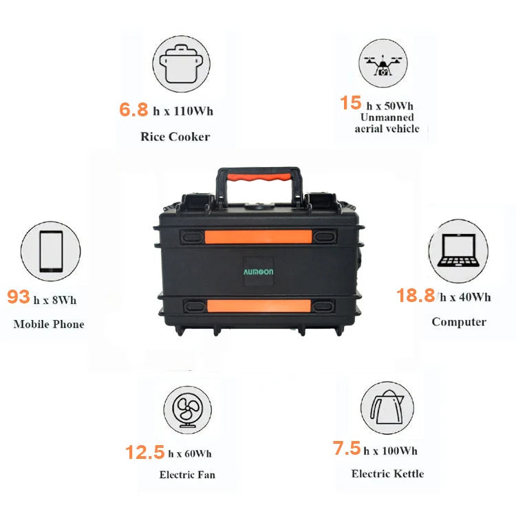 You can have your small household appliance(MAX.300W) like TV,fridgerator, LED light, drone, camera, laptop, router, projectors, smartphone, tablet charged. The compact and lightweight design is perfect for indoor and outdoor activities. with the foldable handle design, it is much space-saving to carry around power anywhere, power anytime.