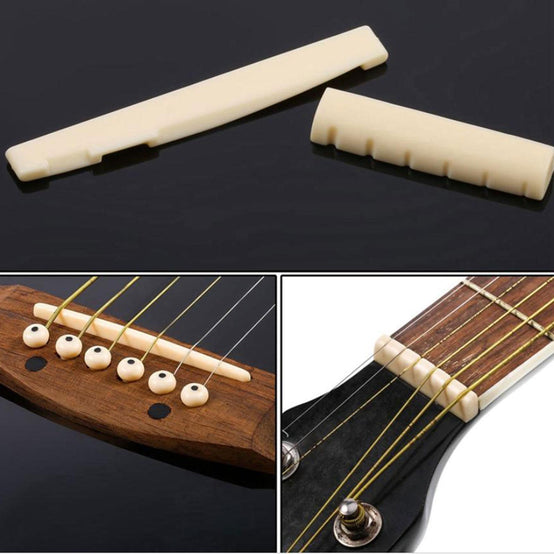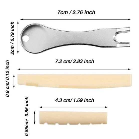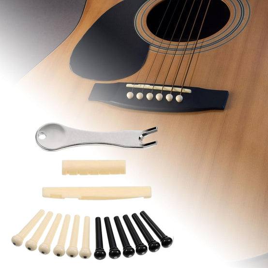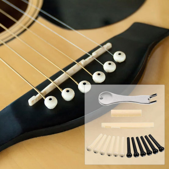 PACKAGE INCLUDES: 1pc Guitar Bridge Pins Puller, 1pc Guitar Saddle, 1pc Guitar Nut, 6pcs White Guitar Bridge Pins, 6pcs Black Guitar Bridge Pins.