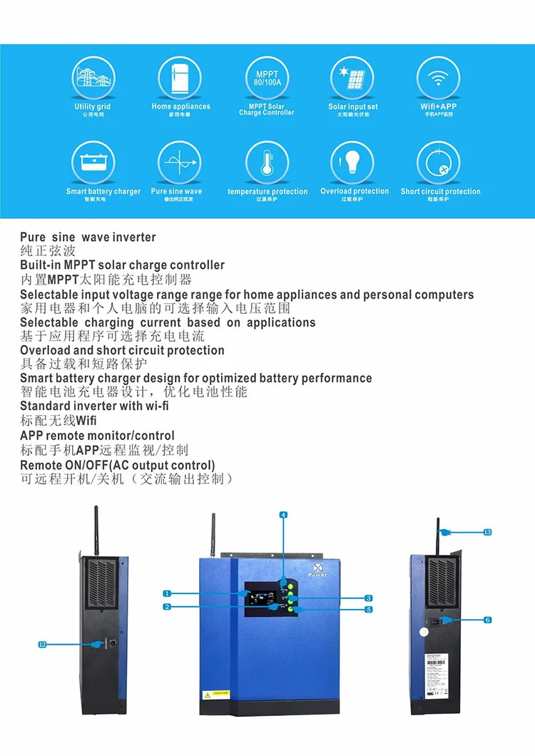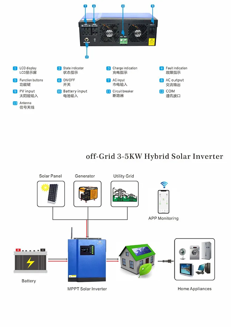 8. AC output 9.PV input 10. Battery input 11. Circuit Breaker 12. COM 13. Antenna