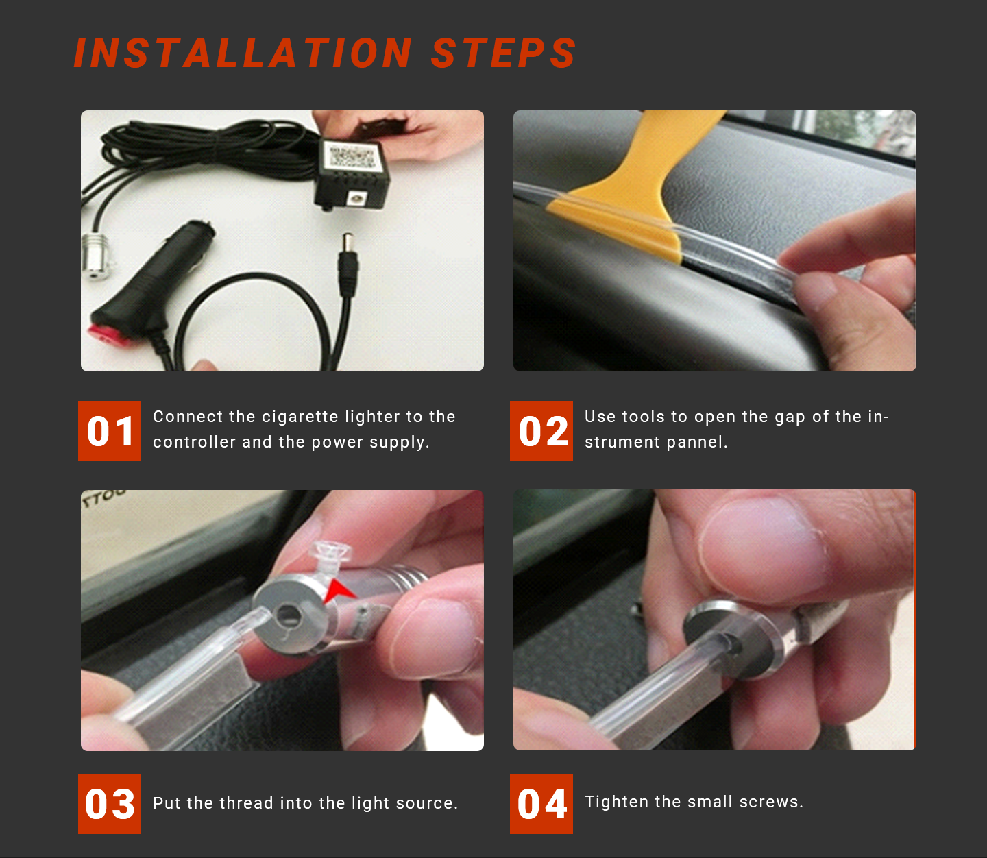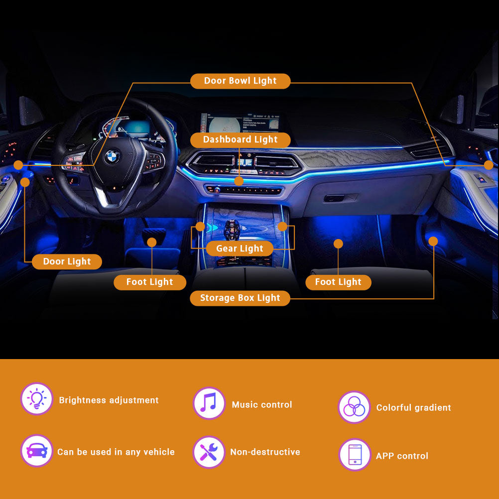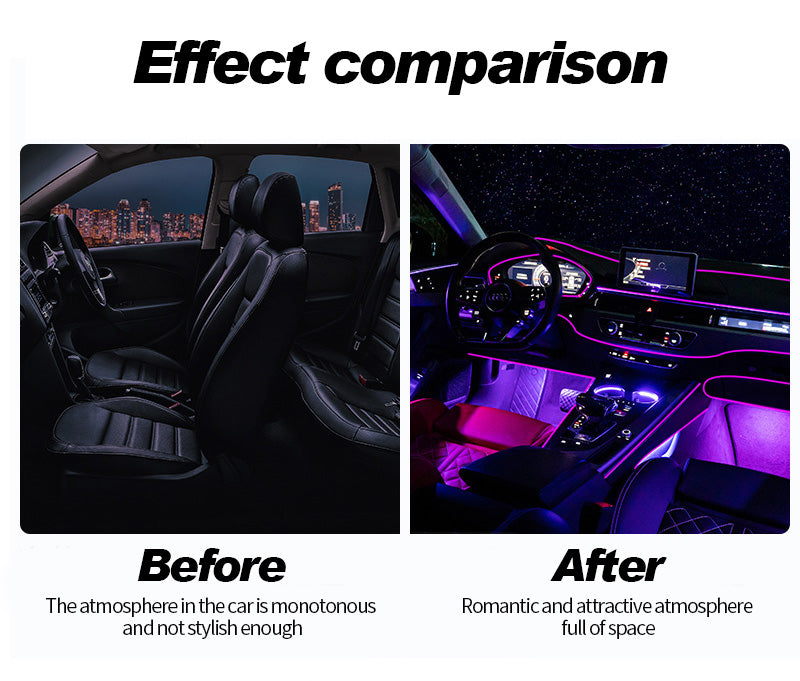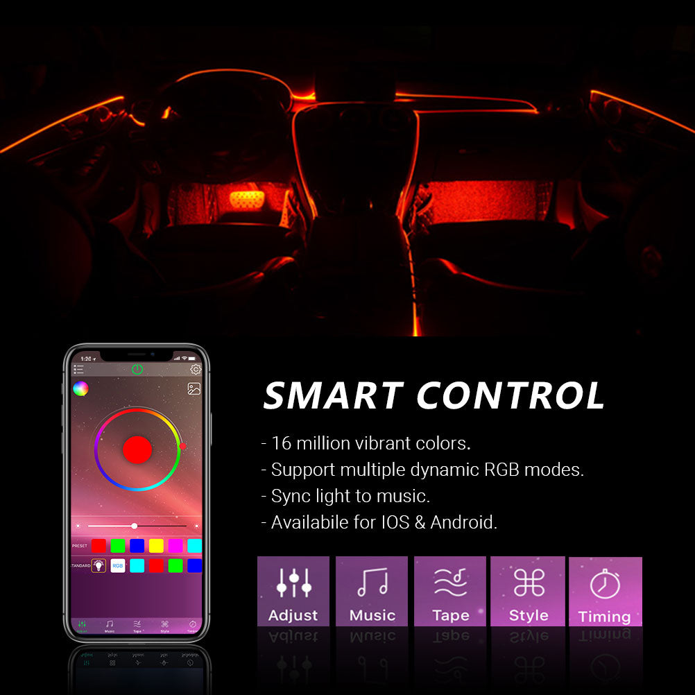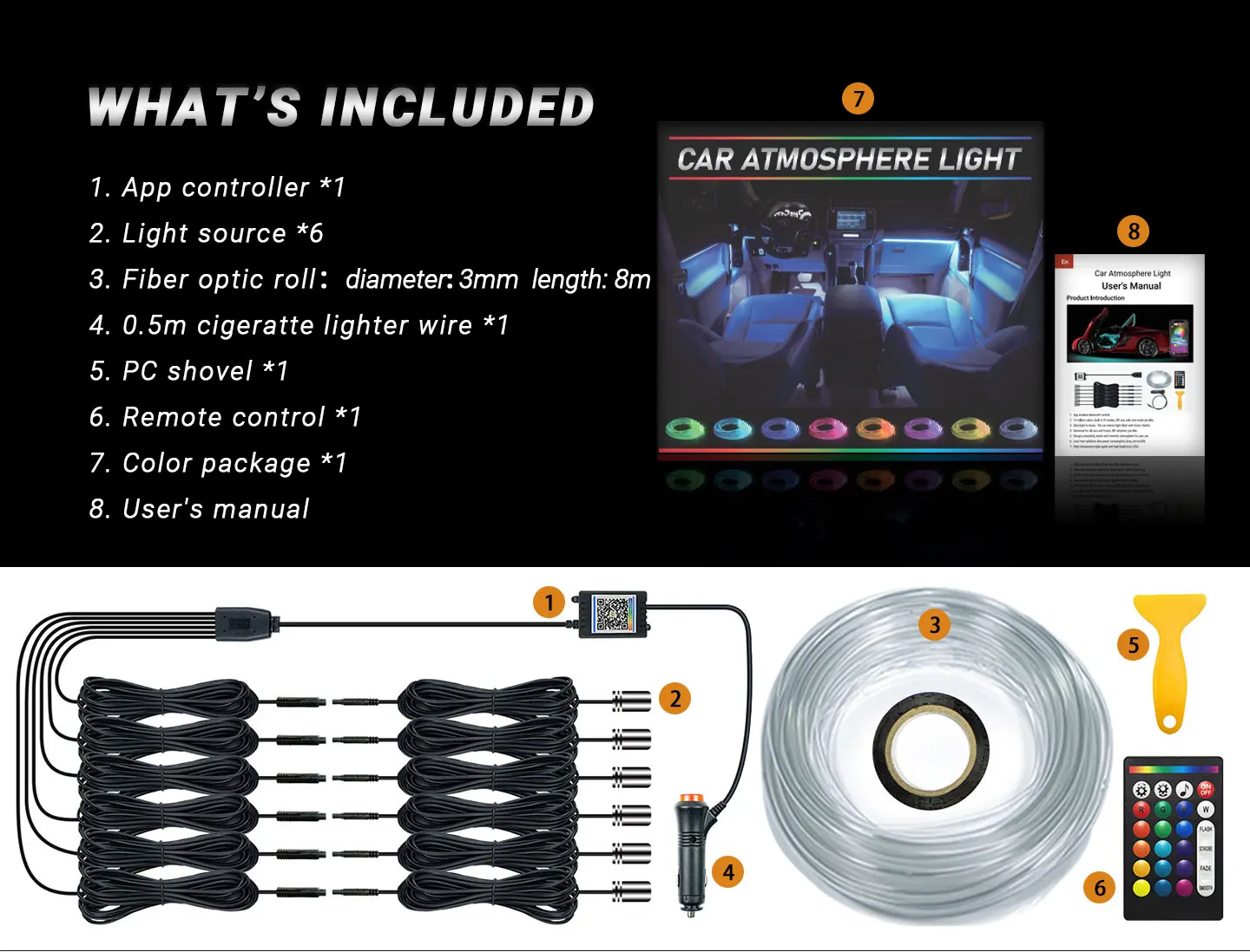 Features: 1: 6M fiber optic rolls + 5w LED heads 2: Support dozens of light modes, such as RGB color changing, sync light to music, voice. 3: More than 16 million colors for option, App control 4: High brightness with low power consumption, ideal for car decoration, parties, camping, bar atmosphere and so on. 5: The fiber optic can be cut to fit, easy to install.