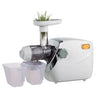 When the raw materials are added into the material feeding hopper, they receive pressure under the boosting of the spiral and the extracted juices will flow into the juice container through the filter screen, and the waste materials will be discharged trough the ring interval formed between the spiral and the pressure adjusting taper part . the movement towards the axial direction by the pressure adjusting head can adjust the size of interval so as to adjust the juice extracting rate .