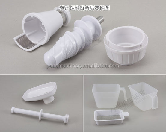 It is consist of the former base , the hopper, spiral, filters, juice hopper, the backer base, shafts and other parts of Java components, spiral spindle bearing on the rolling bearing, the right side bearing on the hand wheel bearings, the motor pulley through a pair of triangular screw driver to work.