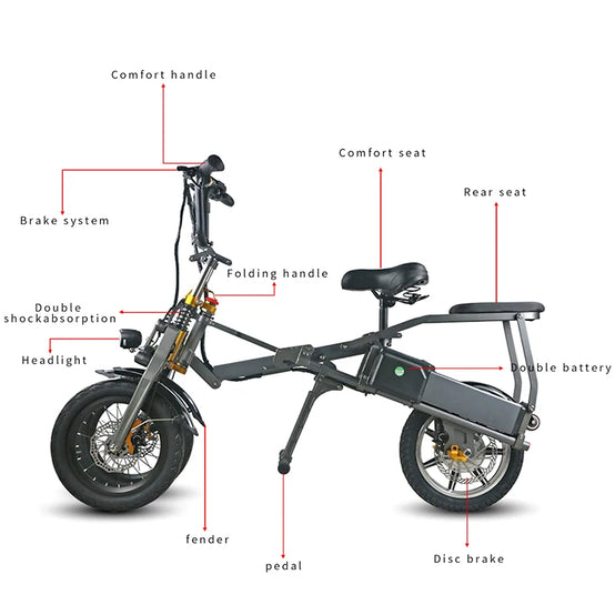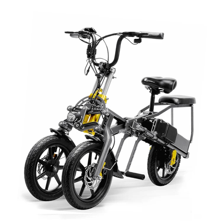 Three wheel electric scooter/bike with 48V 15.6Ah Lithium battery, the range can be 60-70km max after full charge. Powerful kinetic energy with 48V 500W brushless gearless motors for max. cruise speed up to 30km, speed limit 20km. The Bicycle Foldable which folding process takes only a few seconds and takes up little space after folding. If you don't have a garage, you can take it back to the apartment.