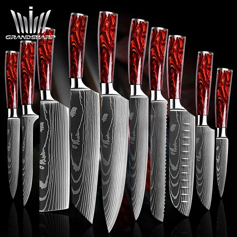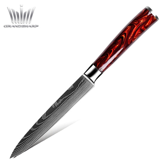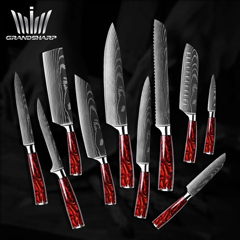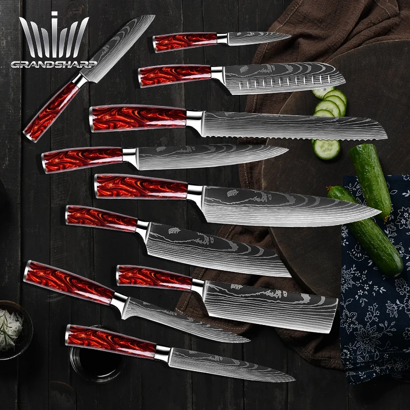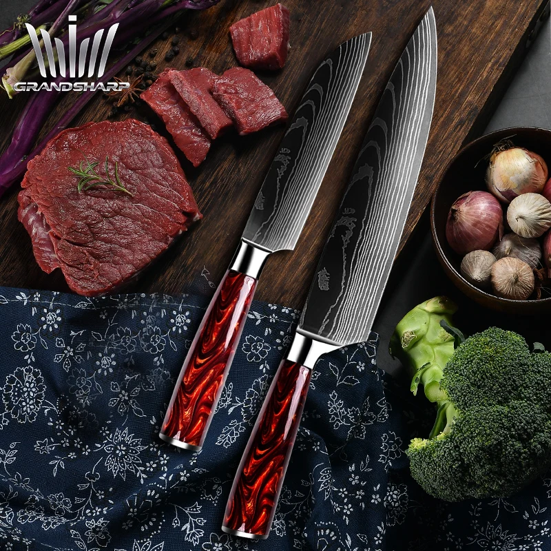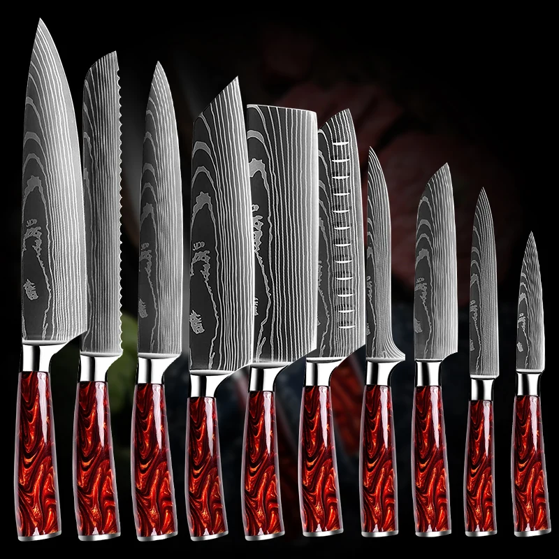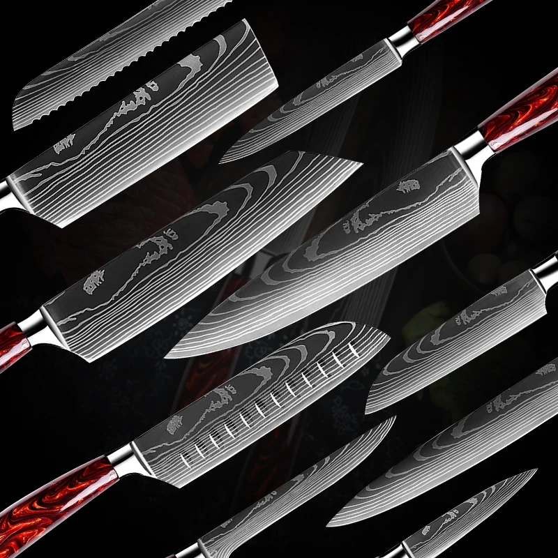 Red Resin Handle Stainless Steel Laser Damascus Pattern Blade Paring Santoku Nakiri Utility Boning Bread Knife Kitchen Knives