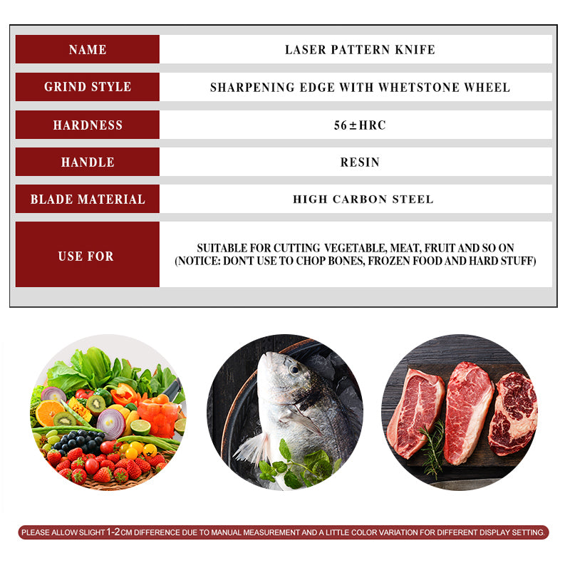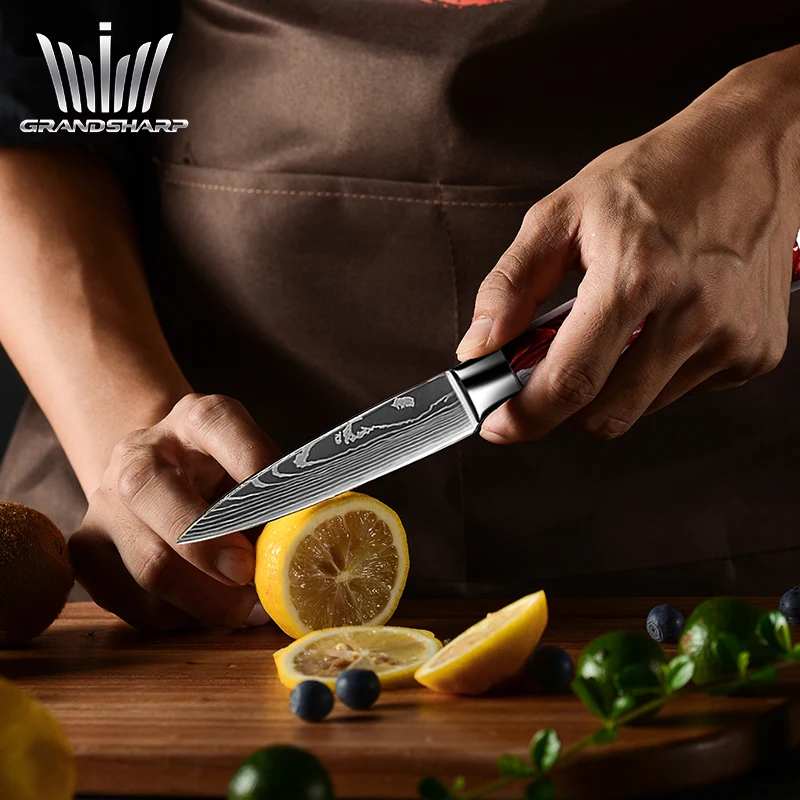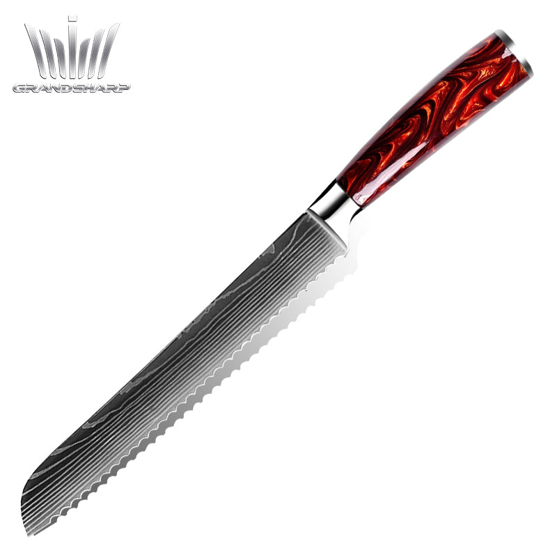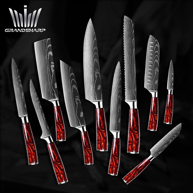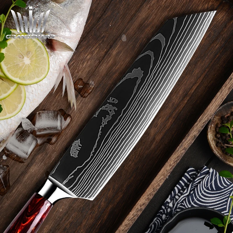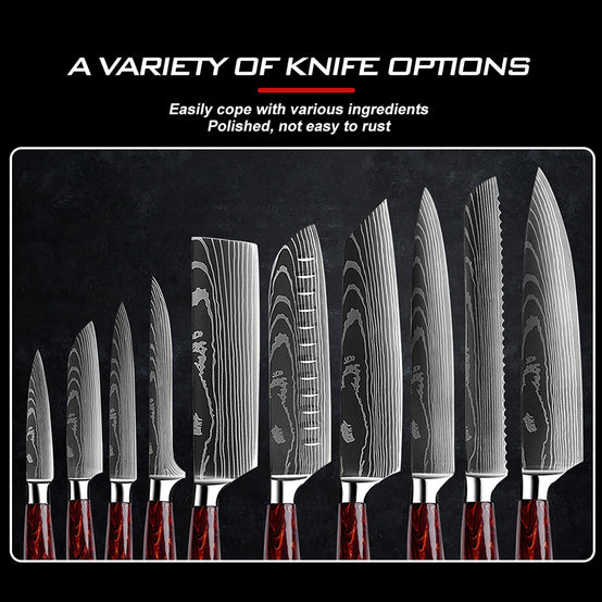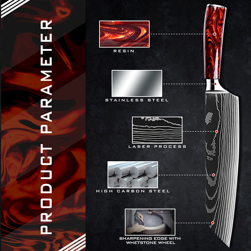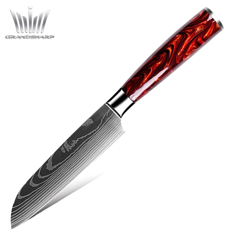 Red Resin Handle Stainless Steel Laser Damascus Pattern Blade Paring Santoku Nakiri Utility Boning Bread Knife Kitchen Knives