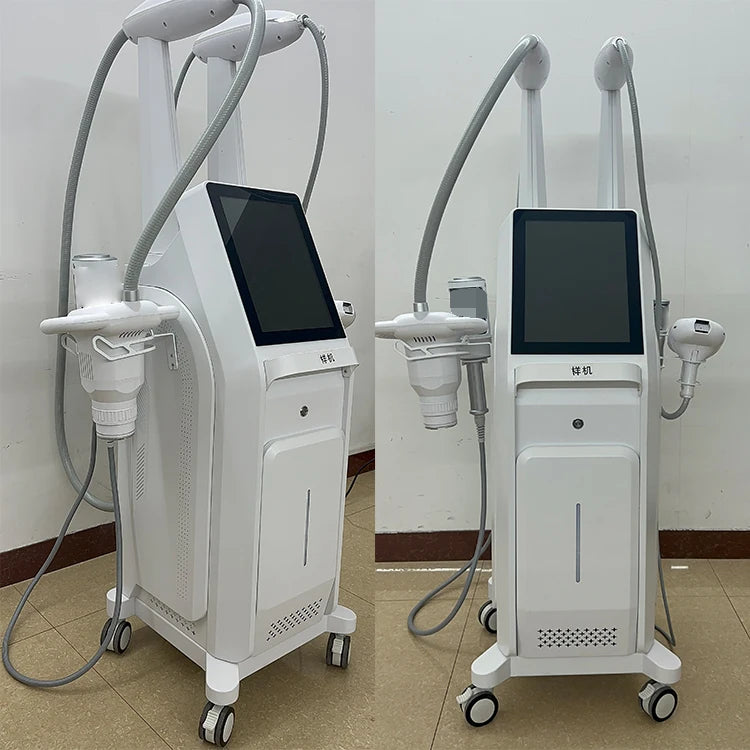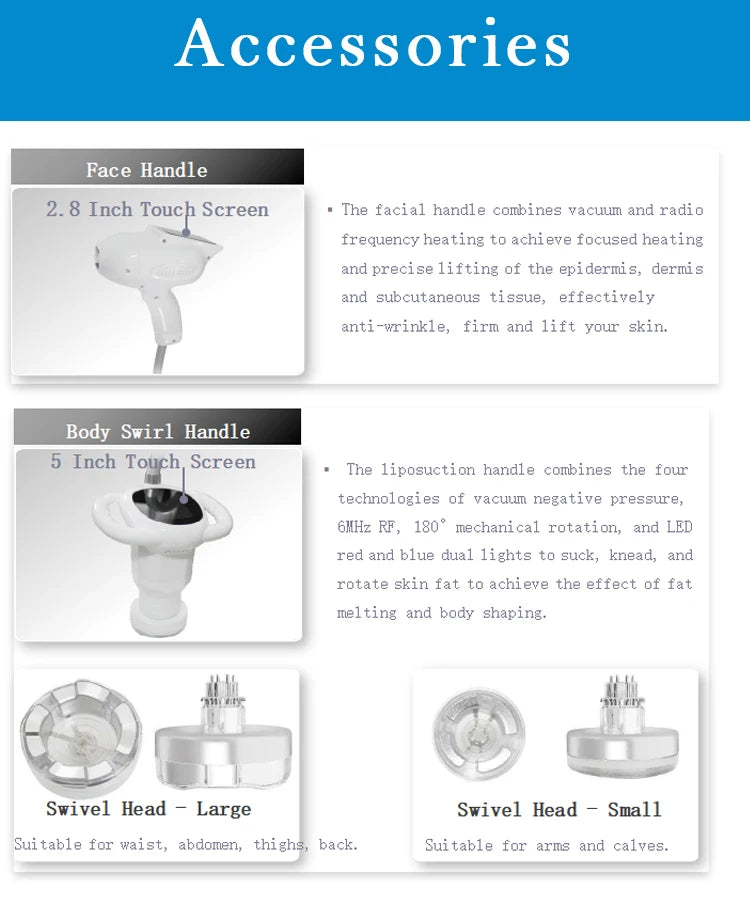 Rotating negative pressure radio frequency instrument uses vacuum negative pressure + 180 ° mechanical rotation + temperature-controlled radio frequency + LED red and blue light technology to pull up the skin together with subcutaneous muscle tissue, deep massage on the body evenly heated, dissolve fat and decompose fat cells into fatty acids and glycerol, and then discharged through the lymphatic circulation, eliminating local stubborn fat, while stimulating the dermis collagen fiber contraction and regeneration, reducing cellulite It also stimulates the contraction and regeneration of collagen fibers in the dermis, reducing cellulite and making the skin tighter and smoother. This results in a balanced body shape and contouring as well as facial rejuvenation. The combination of the four technologies provides aerobic exercises such as suction, pinching and rotation to the skin and fat tissue, and this aerobic exercise can enhance the lymphatic detoxification function and blood circulation four times.