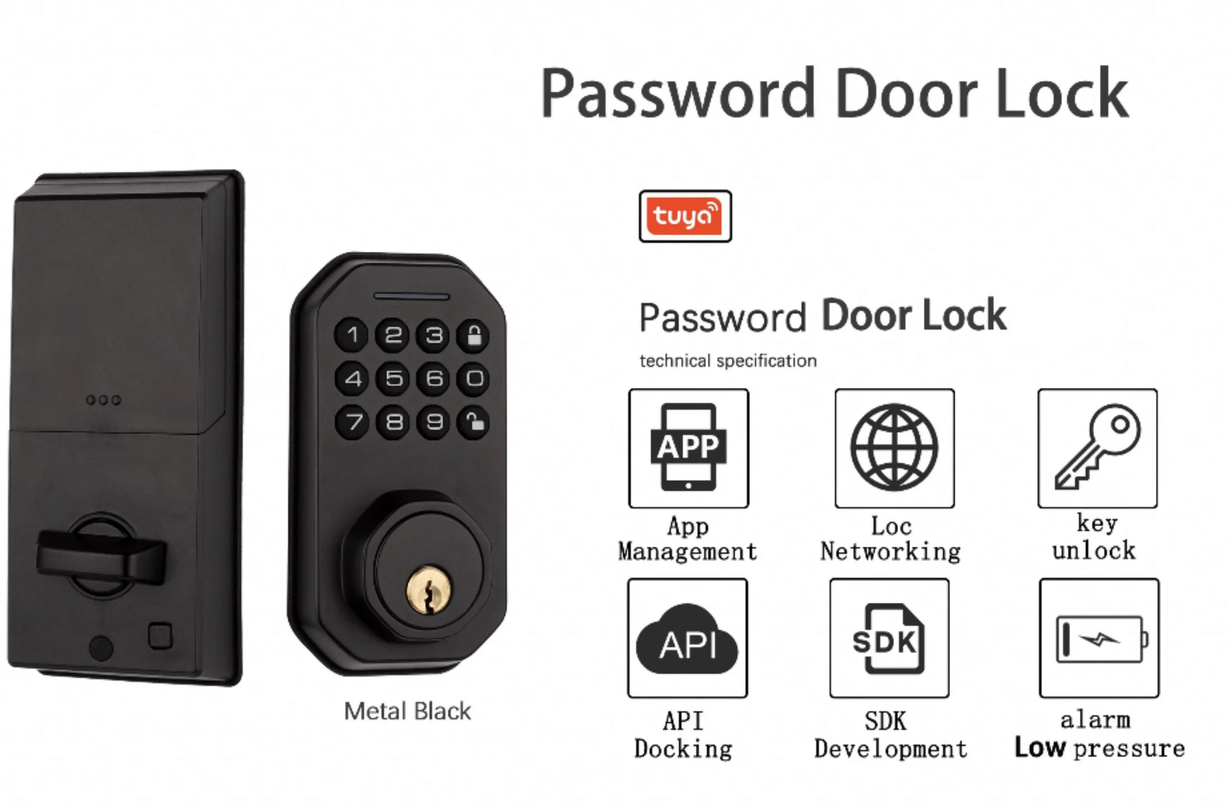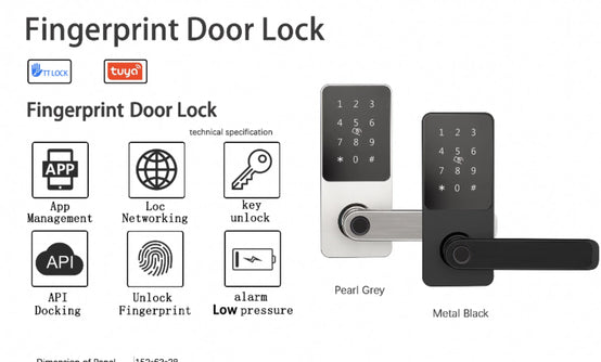 Material: aluminum alloy Color: Black & Gold Lock cylinder grade: Grade C Fingerprint capacity ≤ 150 Password capacity ≤ 150 Battery type: 4 No. 5 dry batteries Voice control by Alexa & Google Home