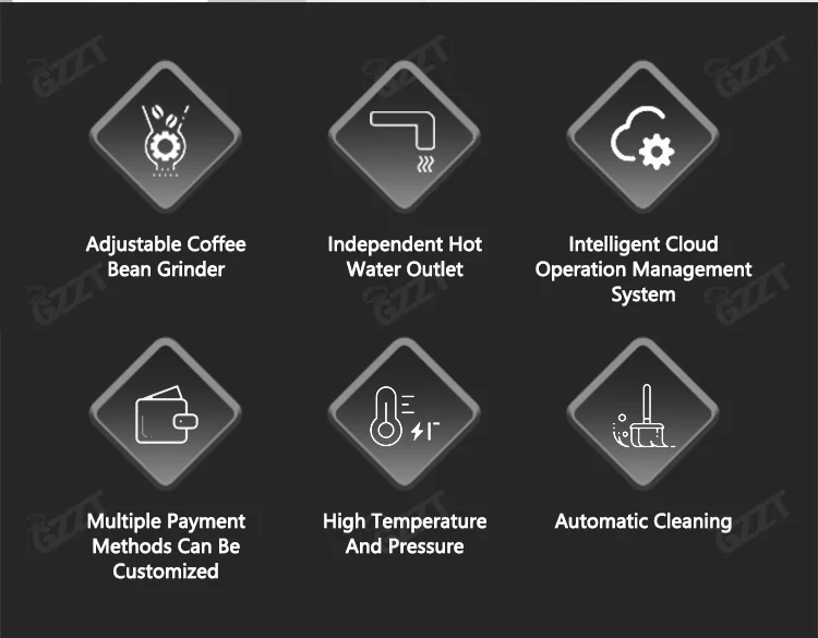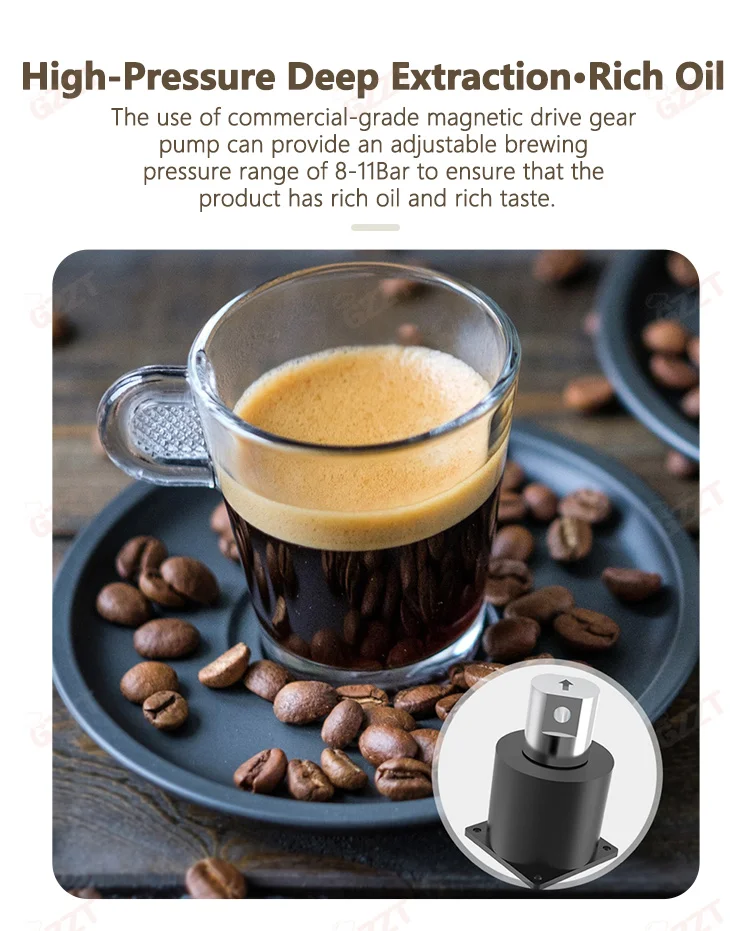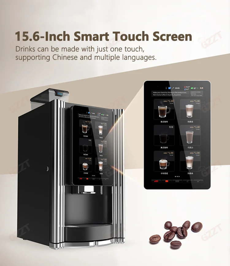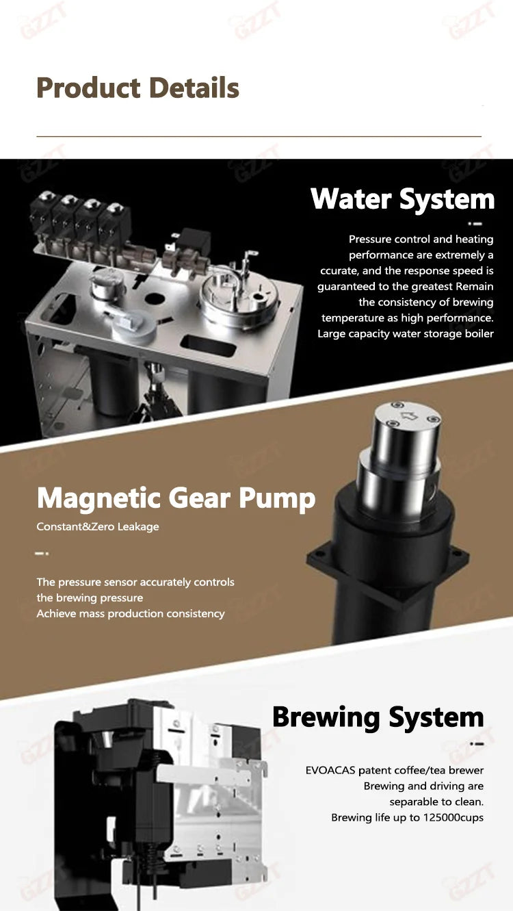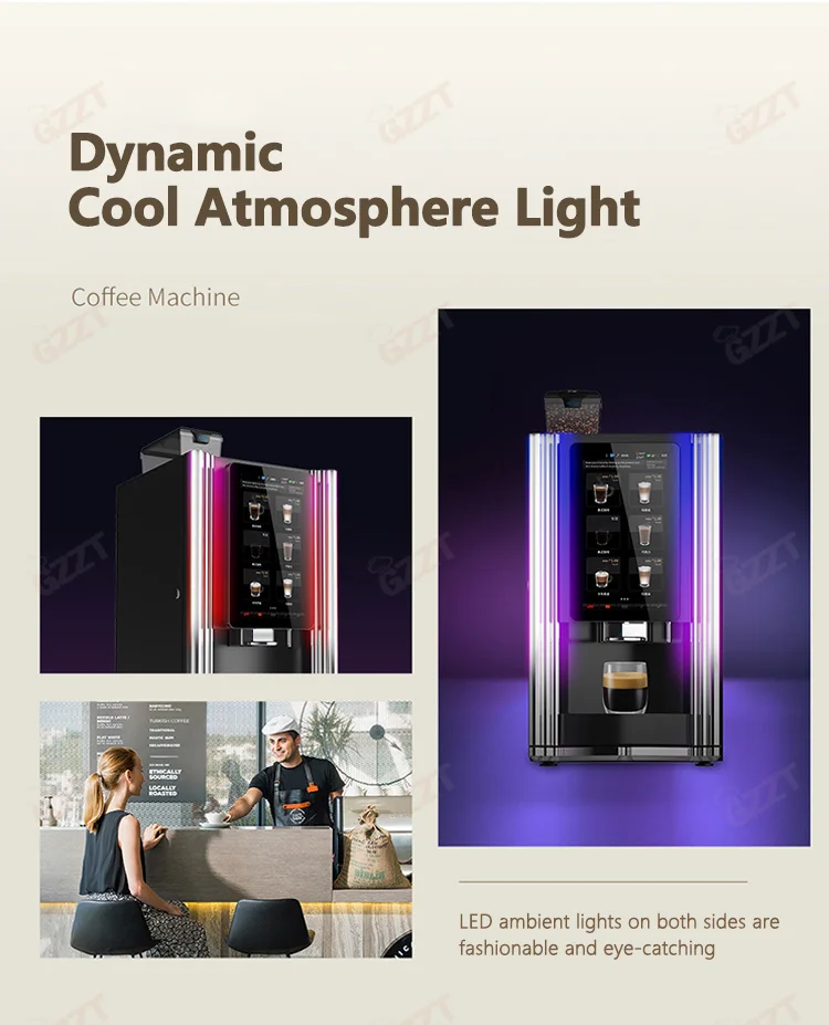 1.Dynamic Cool Atmosphere Light,LED ambient lights on both sides are fashionable. 2.Independent Hot Water Outlet,One-touch hot water can be used to wash cups and make tea, which is convenient and fast 3.15.6-Inch Smart Touch Screen,Drinks can be made with just one touch, supporting Chinese and multiple languages. 4.High Quality Coffee Bean Grinder,The grinding thickness is accurately controllable and the service life is up to 125,000 times. 5.High-Pressure Deep Extraction·Rich Oil. The use of commercial-grade magnetic drive gear pump can provide an adjustable brewing pressure range of 8-11Bar to ensure that the product has rich oil and rich taste.