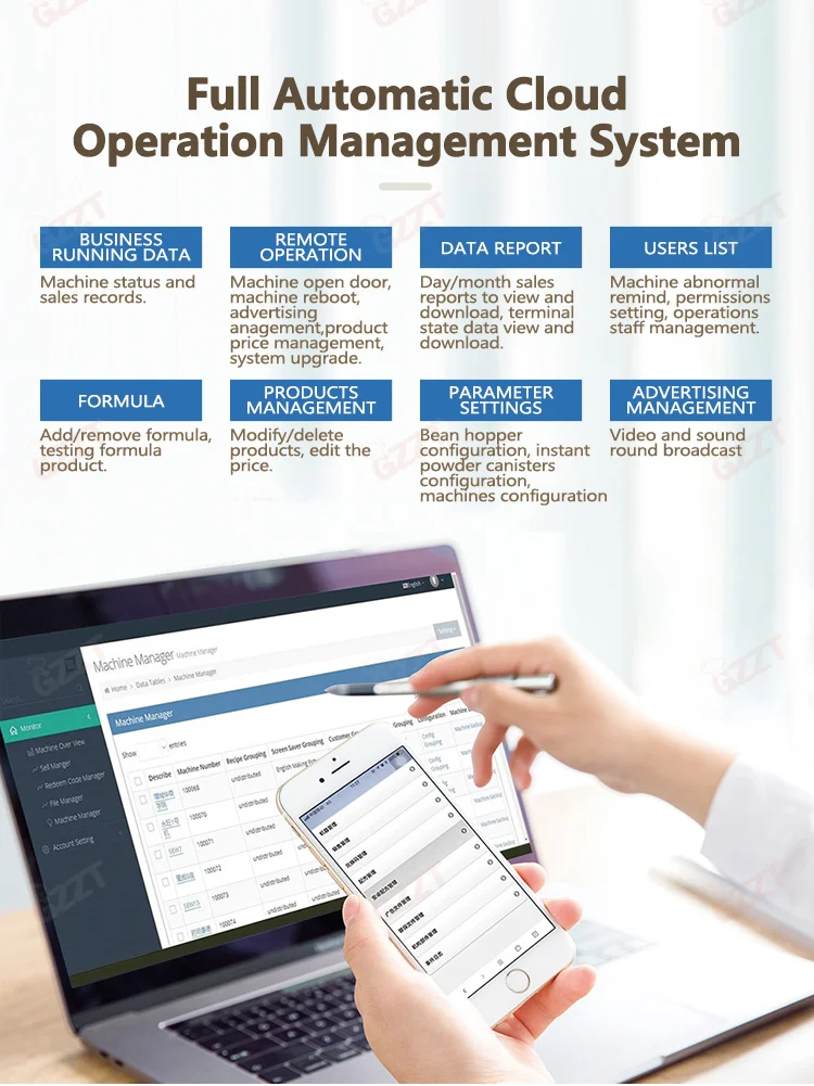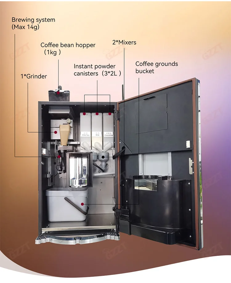1*EVOCA group grinder, 1*Brewer(Max14g), 1*Coffee bean hopper 1kg, 3*Instant powder canisters 2L, 2*Mixers, Hot water system, Remote control system(IO+touch screen)
