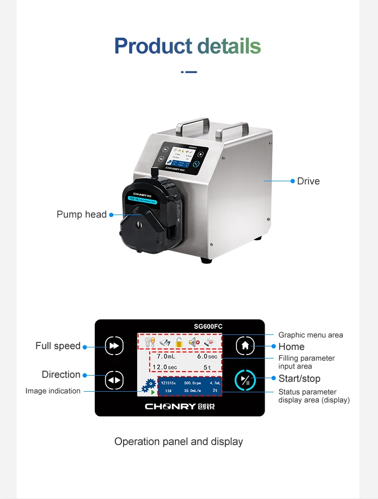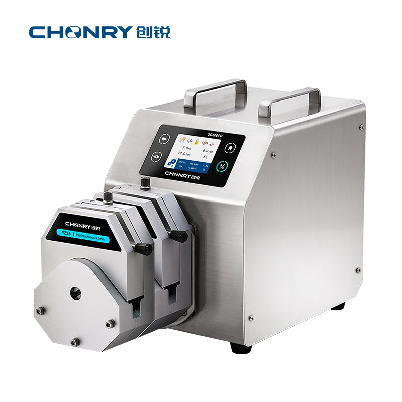SG600FC is a large flow intelligently controlled distribution peristaltic pump. Using a 3.5-inch color LCD touch screen display, the operation is simple and intuitive. It has two working modes: transmission and distribution. It can be intelligently set according to different working needs. The motor has strong torque and is suitable for YZ35, YZ35-13L and YZ35LS pump heads. It can be used for Data storage, supports RS485MODBUS and other remote control modes.