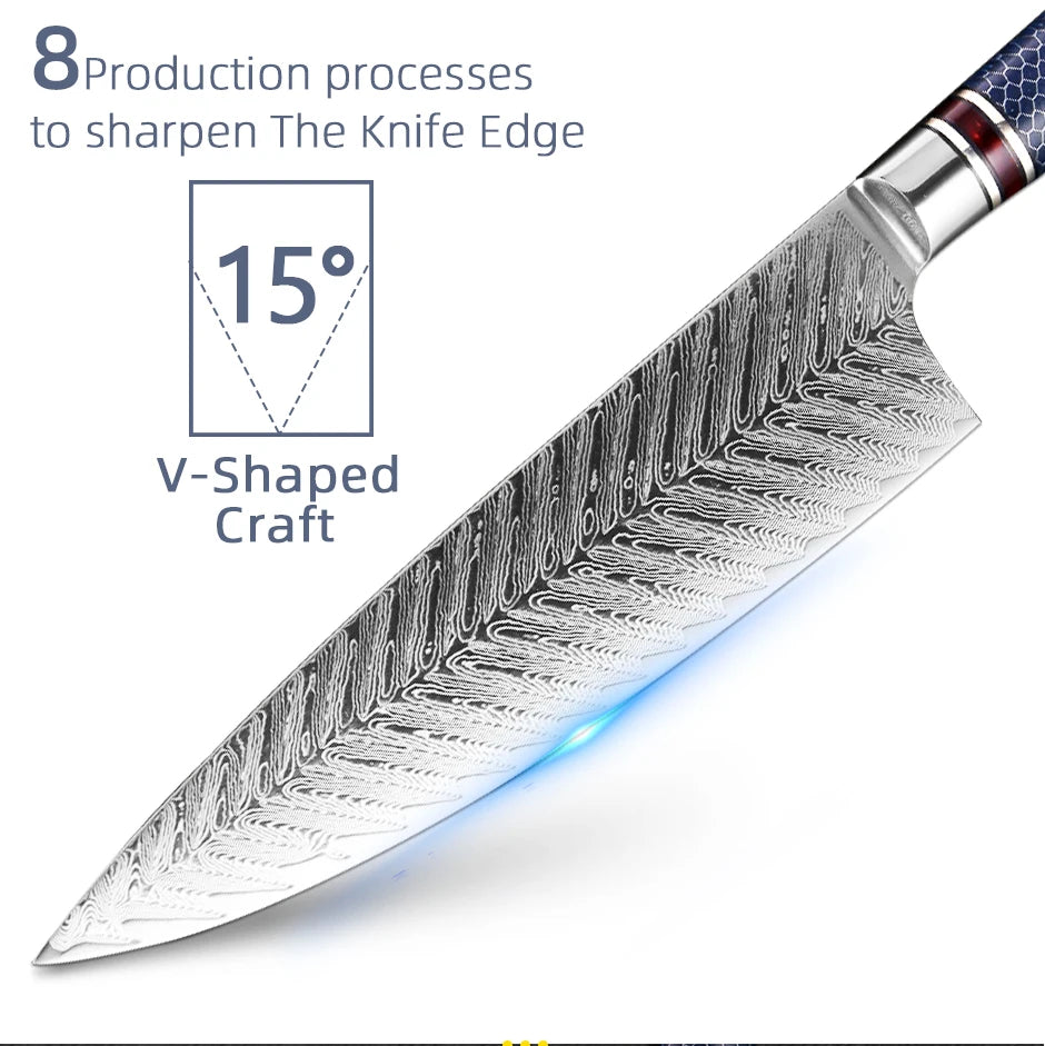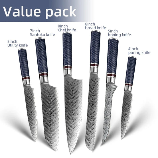 Sharp Blade Blue Resin Wood Handle Damascus Steel VG10 Kitchen Knives Set