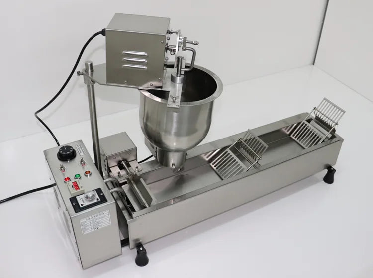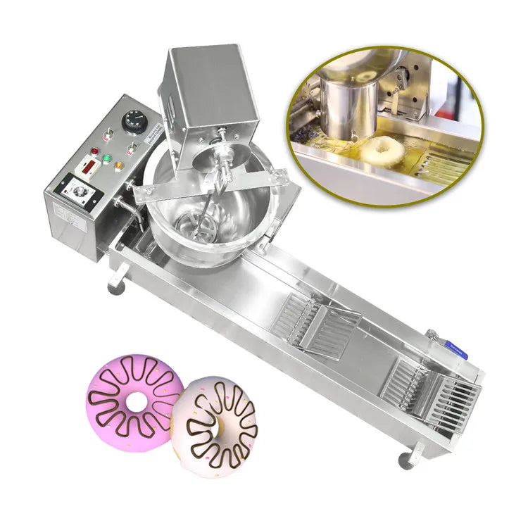 1.Donut machine is a versatile machine,it can shape,flip,transfer and fry donut.this model machine with 3 molds,full stainless steel material, automatic with counting system,Tank track technology.Chain conveyor turn bread technology. 2.The temperature of oil in the slot will be controlled by controller which keep temperture system. you can turn to choose your time easier. 3.The hypertrophy of donut can also be adjusted by how much of the material. 4.This machine use precise orbit devices, import motor, which maintaining equipment vibration in the smallest value.