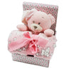 Blanket with stuffed bear toy and paper colored box