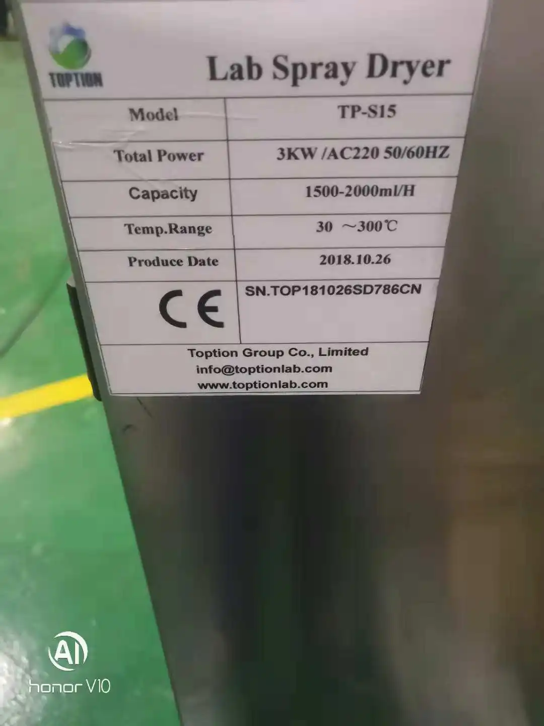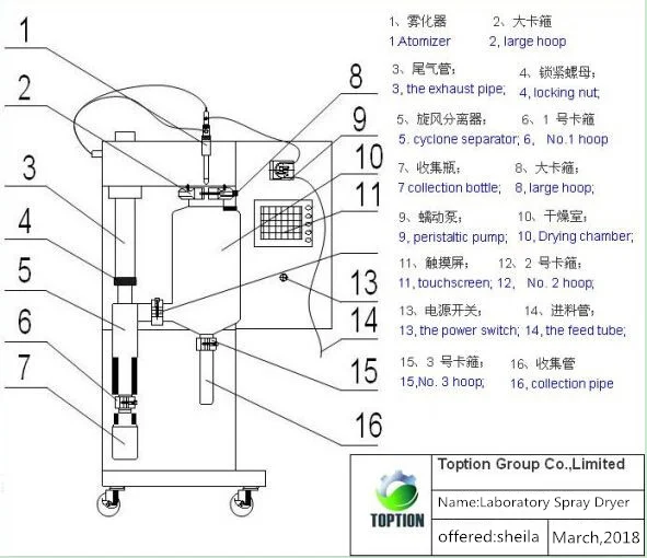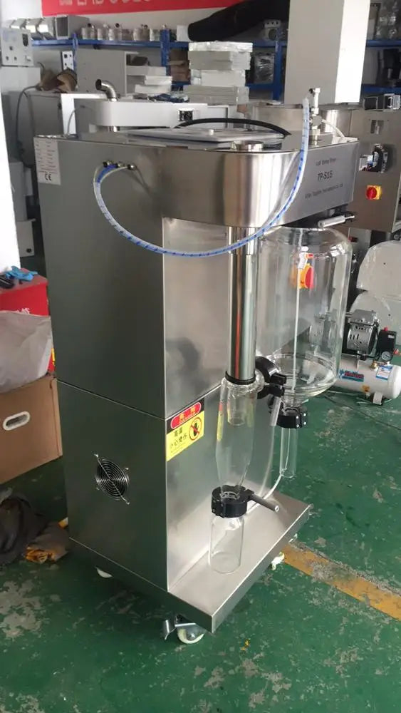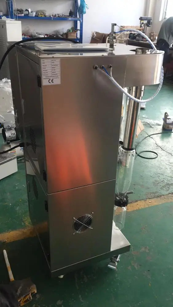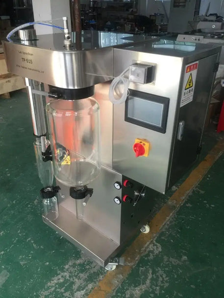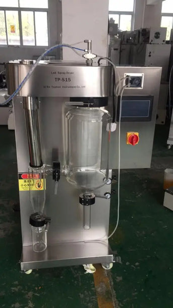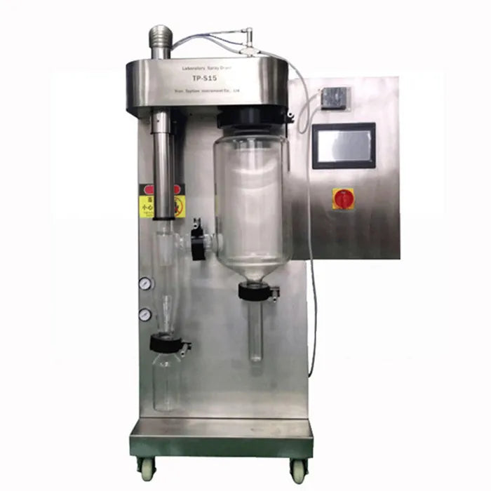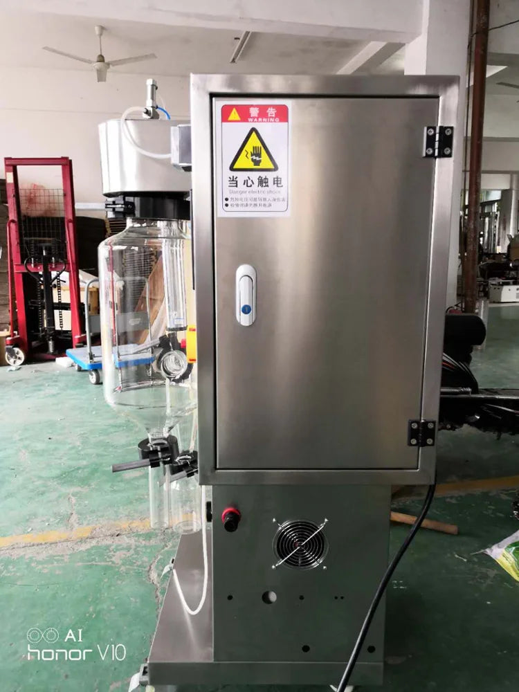 This Lab spray dryer has Stainless steel shell and arc corner design.Equip with imported Schneider electrical components,PLC control system,self-priming peristaltic pump and oil-free air compressor,is suitable for producing solid powder or particle products from liquid materials drying,such as emulsion, suspending liquid, liquor and so on.