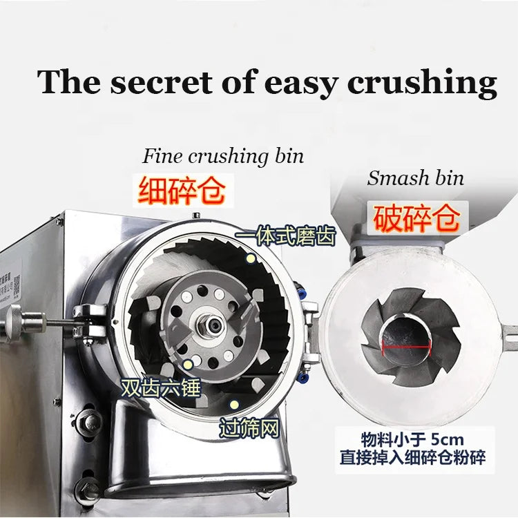 The Water-cooled continuous feeding mill crushing powder machine is an professional and ideal machine to grinding and milling different kinds of dry food, Chinese herbs or other different kinds of seasonings. The crusher cavity and the door cover are hollow, respectively with water inlet and outlet. The cold water or the cooling liquid flow into the machine. The cooling liquid circulate in the machine cavity and then flow out the machine, so that it will greatly reduce the temperature of the crushing cavity to provide a crushing environment with low temperature.
