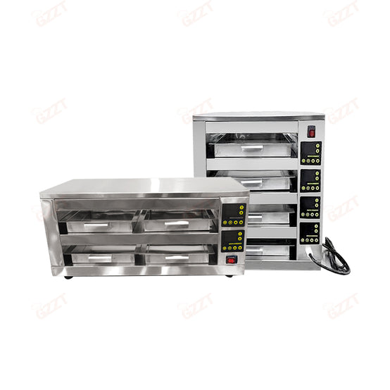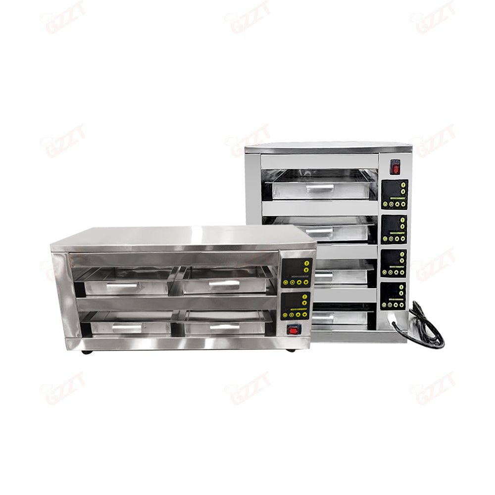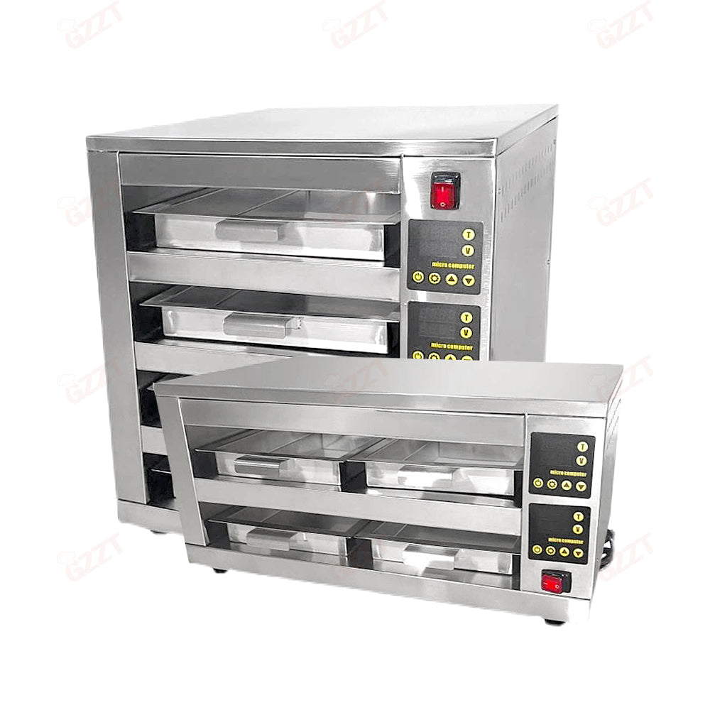 1. LED digital display screen: easy to read the set parameters in the working state 2, built-in microcomputer controller, fully independent temperature control: The insulation temperature progress of each layer can be set separately, and the outside is equipped with an independent power switch, which can be turned off when not in use, saving power and energy 3. There are two independently controlled timing displays before and after each layer The timing time range can be preset from 1 second to 99 minutes and 59 seconds, and the user can adjust the holding time for different things as needed. Turn off any of the timing monitors. It doesn't affect the other set of timings, needle Different storage areas can be selected for foods that need a crisp appearance or a crisp appearance. 4, the function of video preservation time: it can be controlled at any time during busy hours. 5, imported original WTC superconductor heating film, with wear-resistant environmentally friendly heating aluminum plate: uniform heating, and automatic constant temperature function, effectively save energy consumption 30% 6, dual-channel design: easy for users to access food in the front and back direction of the operation, the machine has a timing display, showing the same holding time, easy to view. 7. Several plates can withstand high temperature to 190°C to ensure food hygiene and safety. 8, stainless steel body: durable, easy to clean.