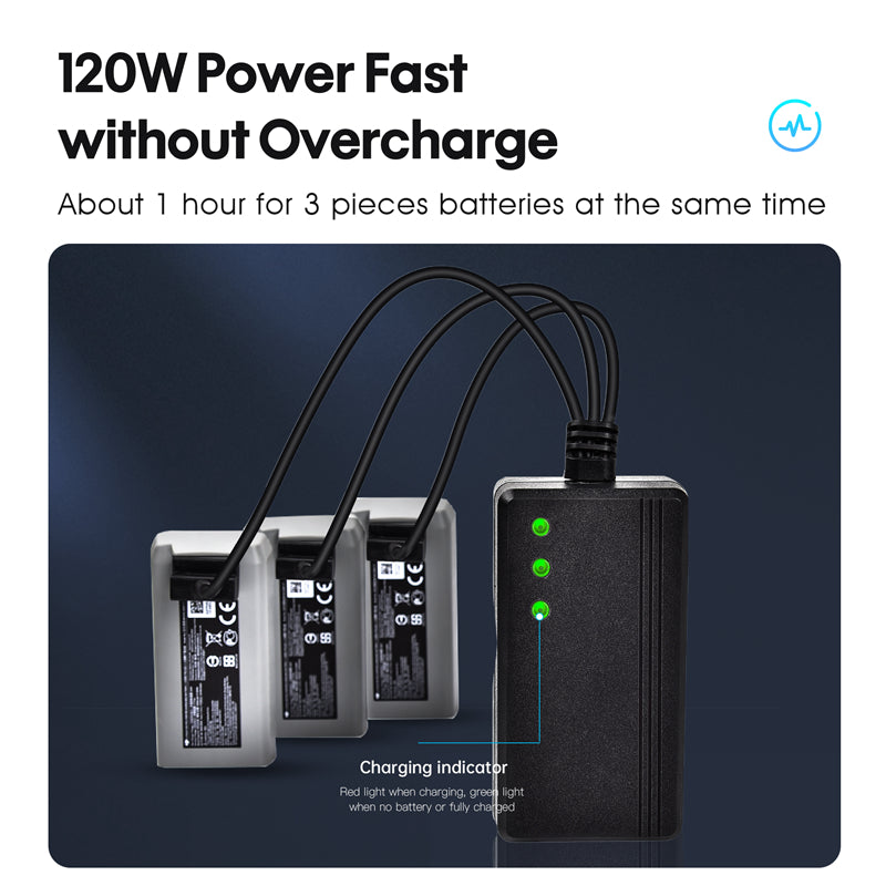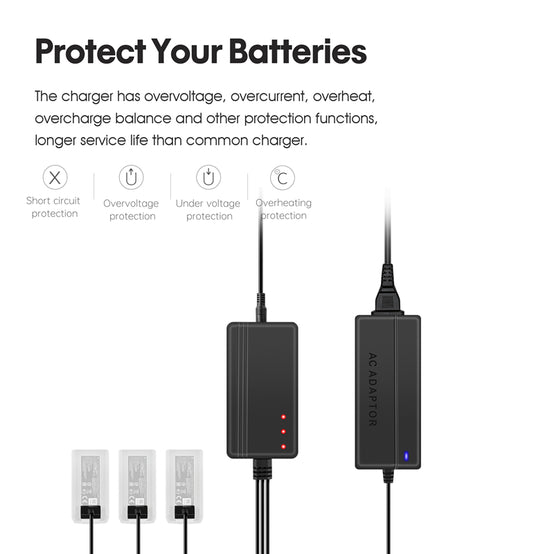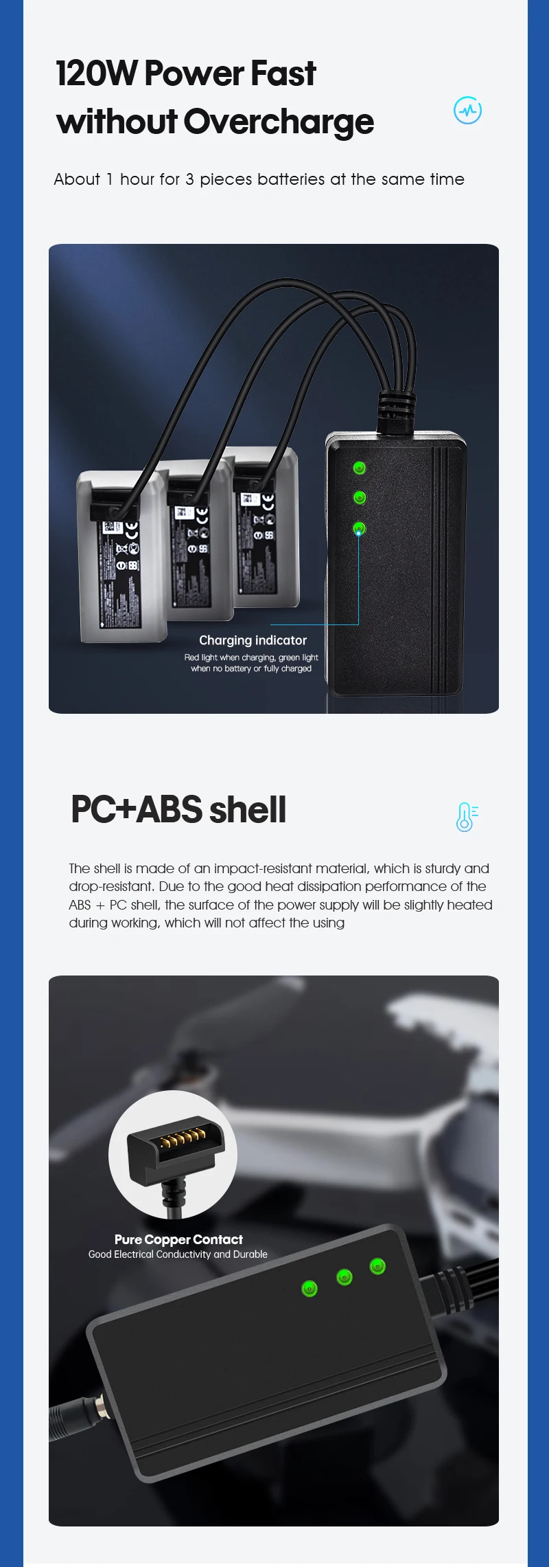 The charger was designed for Mavic Mini/Mini 2 /Mini SE series drone battery specially. Its advantages included rich interfaces, environmental protection, energy saving, light weight, easy to carry and so on. Three batteries can be charged at the same time quickly. 1. Intelligent one drag three, can simultaneously charge three groups of batteries, charging time only about one hour; 2. Built-in short-circuit, overheat, overvoltage, undervoltage four-fold protection arrangement, intelligent charging does not hurt the battery; 3. The charger is connected to the power cord for stable power supply. The line length is 2 meters, and there is no binding anytime and anywhere. 4. The charger can also be used for on-board power access. Model: 1110513/1110515 For: Mini SE /Mini 2 / Mavic Mini battery Net weight: 371g Storage temperature: -10°C~60°C Rated input: DC12V 5A, home adapter (AC100-240V) Rated output: DC8.4V2A* 3 (3 channels) Working temperature : -10°C~60°C Working humidity : 5%~90% Charging time: About 1 hour for 3 pieces batteries at the same time Charging Indicator: The indicator will be on and red when charging, the indicator will be on and green when fully charged or non battery Protection functions: Short circuit protection (SCP), overheating protection (OTP),overvoltage protection (OVP), undervoltage protection (UVLO)