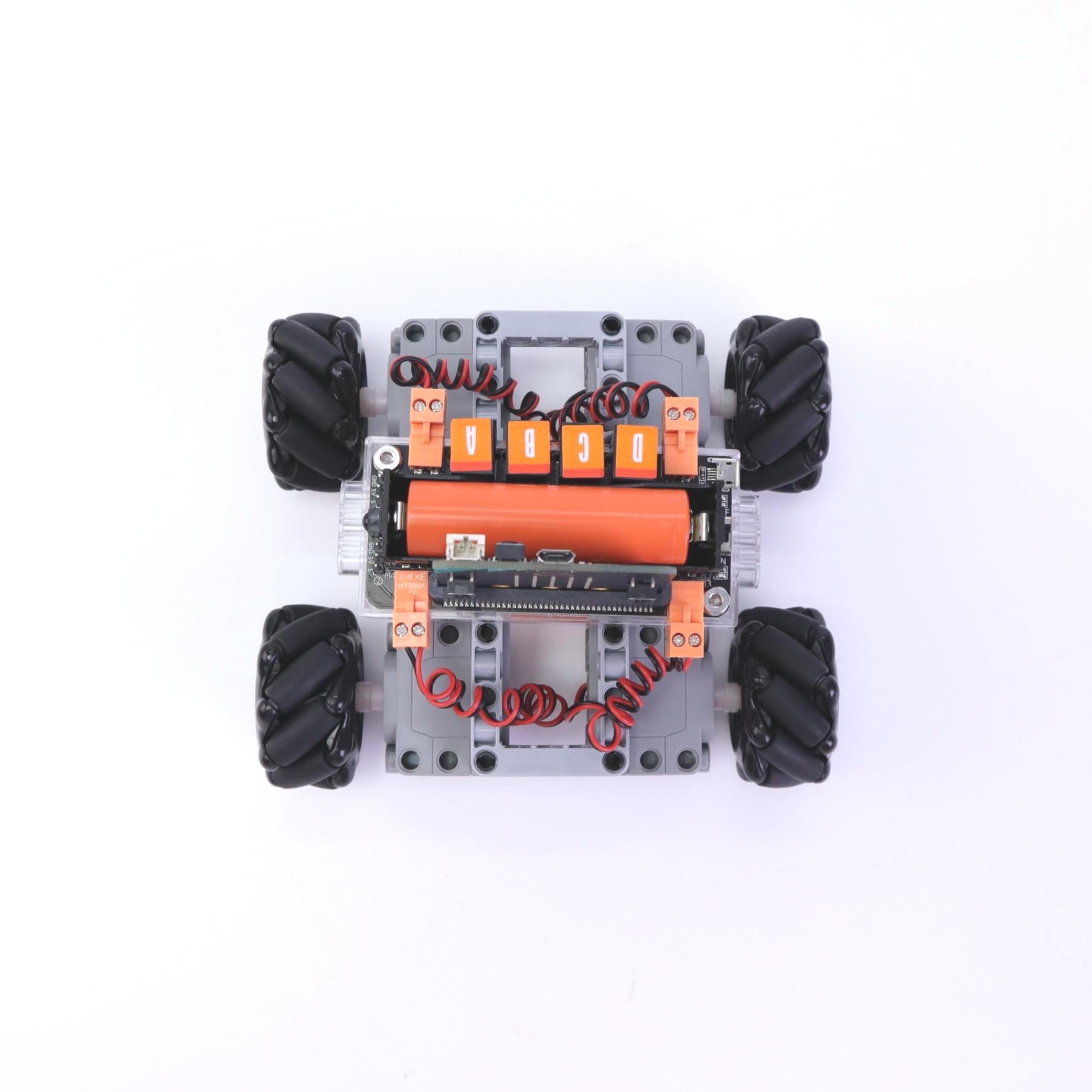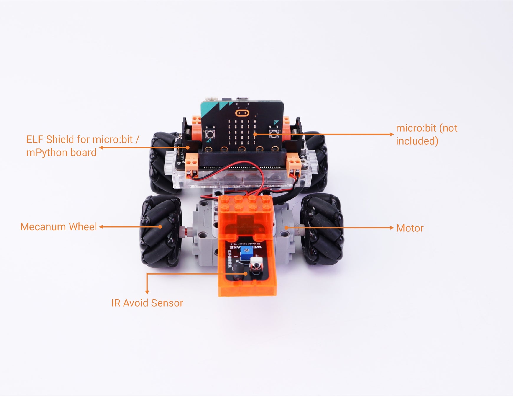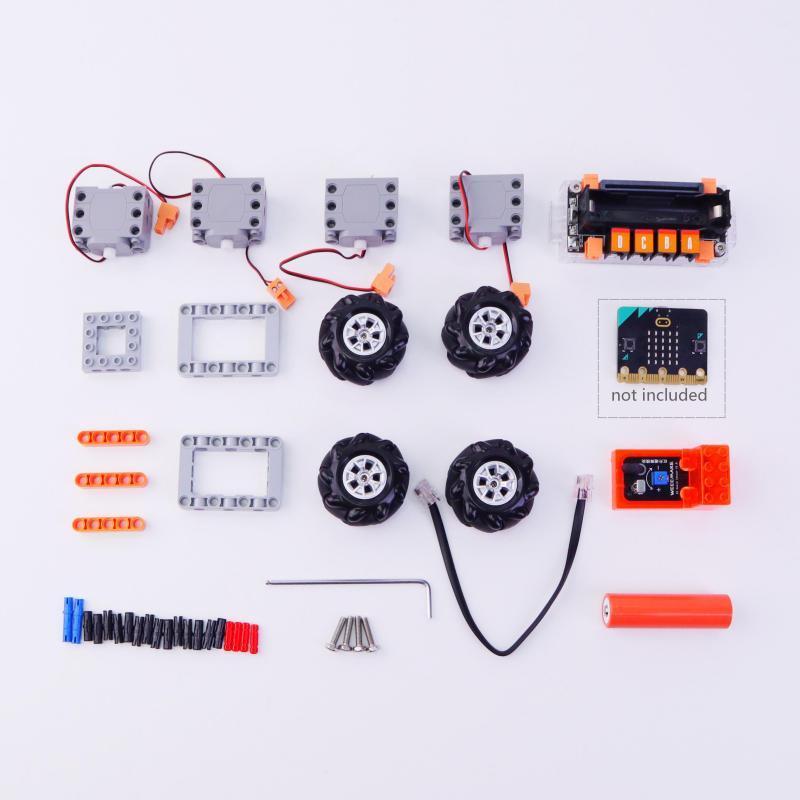Controller: micro:bit V2 / mPython board (not included) Sheild specifications: 1 x controller slot, 4 x dc motor port, 2 x servo motor port, 1 x IR receiver, 1 x 18650 Lithium battery Motors: 2x Block compatible motor - L, 2x Block compatible motor - R Wheels: 4 x mecanum wheel Sensor: IR Avoid Sensor x1 RJ11 Cable -20cm x1 Micro USB Cable x1