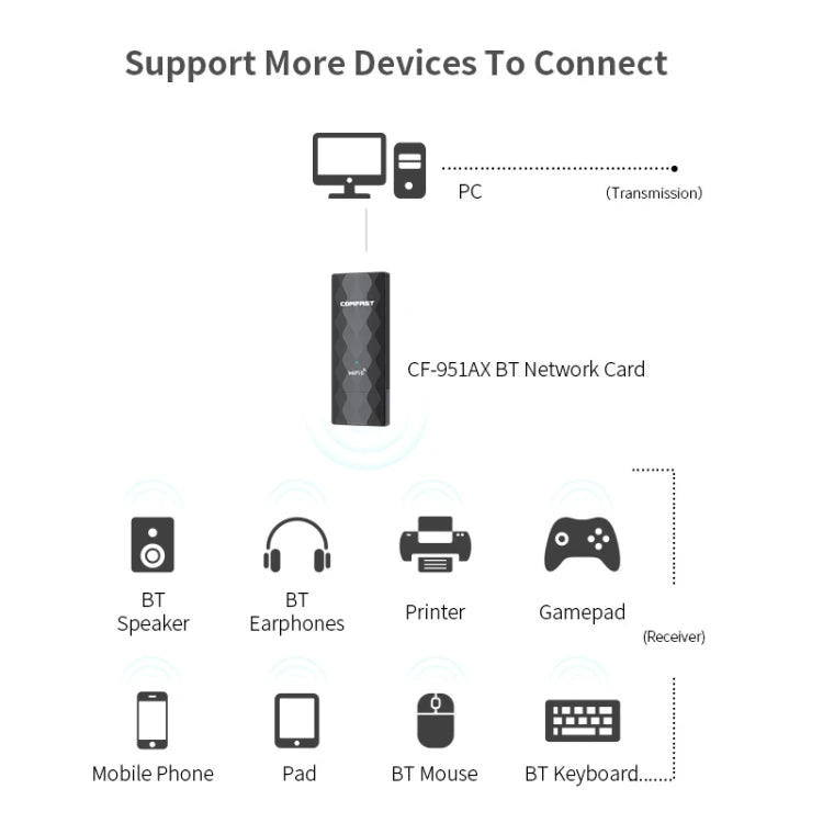 1. Interface: USB3.0, compatible with USB2.0 2. Working frequency band: 2.412GHz-2.484GHz, 5.180-5.825GHz 3. Wireless standard: support IEEE802.11a/b/g/n/ac standard 4. Compatible with multiple systems: Win10 (32/64-bit), Win11 (64-bit) 5. 1800Mbps transfer rate 6. Product size: 8x3.1x1cm
